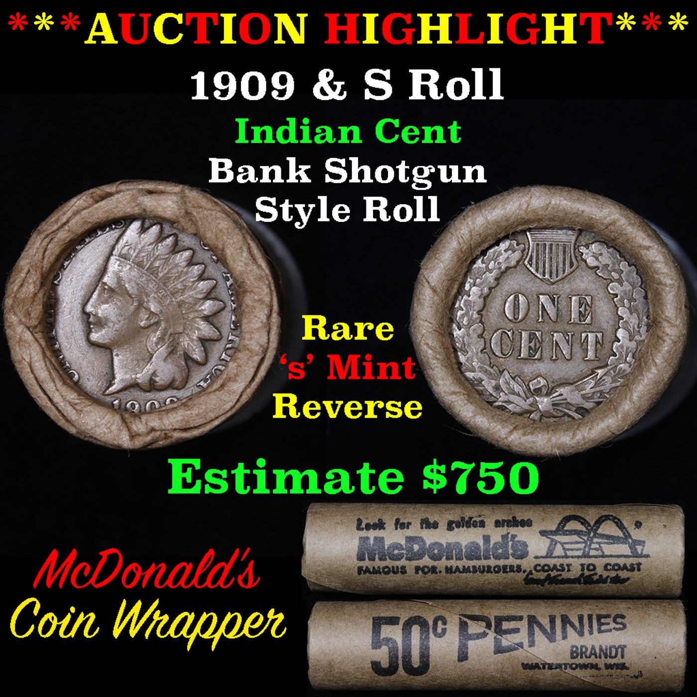 Lincoln Wheat cent 1c orig roll, 1909 end S other end Grades. Lincoln Wheat cent 1c original Shotgun Roll, 1909 on one end, S reverse on the other. The roll is held in a Rare & Collectable McDonalds Brandt wrapper. Actual roll pictured is the roll you will get. A great original bank shotgun roll with very tight ends. From the feedback we have been receiving, people are happy with these rolls, nearly half the roll seems to be teens, all the rolls have a few Indians, most of the rolls have some steel cents, and a lot of the wheaties are mintmarks. These shotgun rolls are all from a new consignee. They are all frrom one Estate. This particular Roll shows a 1909 on one end and a S reverse on the other end.