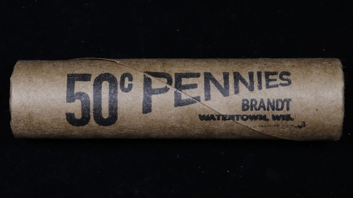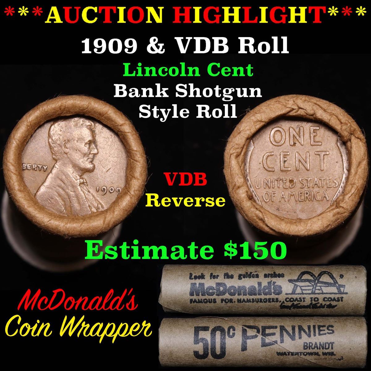 Lincoln Wheat cent 1c orig roll, 1909 end, VDB other end. Lincoln Wheat cent 1c original Shotgun Roll, 1909 on one end, VDB reverse on the other. The roll is held in a Rare & Collectable McDonalds Brandt wrapper. Actual roll pictured is the roll you will get. A great original bank shotgun roll with very tight ends. From the feedback we have been receiving, people are happy with these rolls, nearly half the roll seems to be teens, all the rolls have a few Indians, most of the rolls have some steel cents, and a lot of the wheaties are mintmarks. These shotgun rolls are all from a new consignee. They are all frrom one Estate. This particular Roll shows a 1909 on one end and a VDB reverse on the other end.