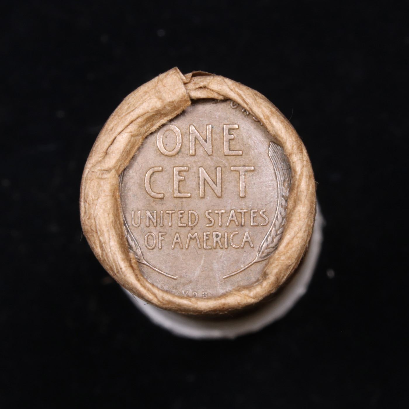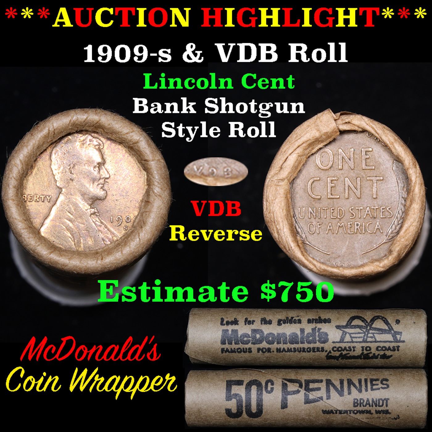 Lincoln Wheat cent 1c orig roll, 1909-s end, VDB other end Grades. Lincoln Wheat cent 1c original Shotgun Roll, 1909-s on one end, VDB reverse on the other. The roll is held in a Rare & Collectable McDonalds Brandt wrapper. Actual roll pictured is the roll you will get. A great original bank shotgun roll with very tight ends. From the feedback we have been receiving, people are happy with these rolls, nearly half the roll seems to be teens, all the rolls have a few Indians, most of the rolls have some steel cents, and a lot of the wheaties are mintmarks. These shotgun rolls are all from a new consignee. They are all frrom one Estate. This particular Roll shows a 1909-s on one end and a VDB reverse on the other end.
