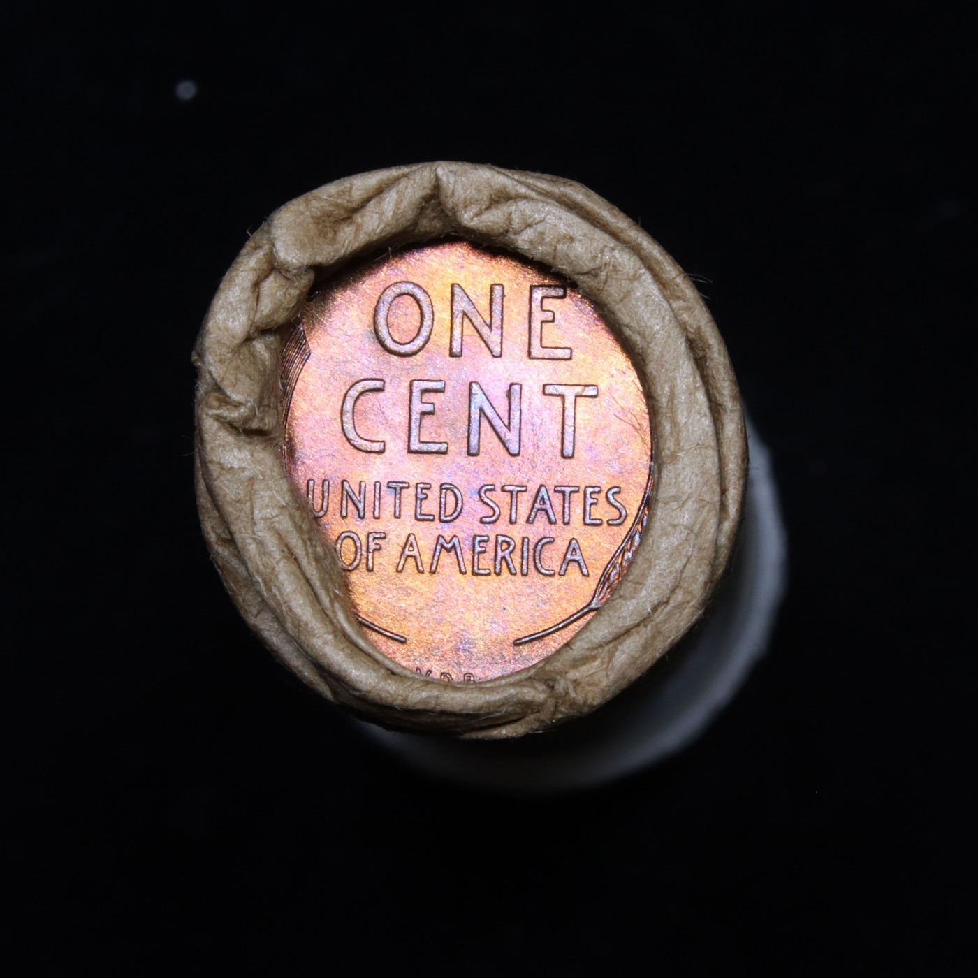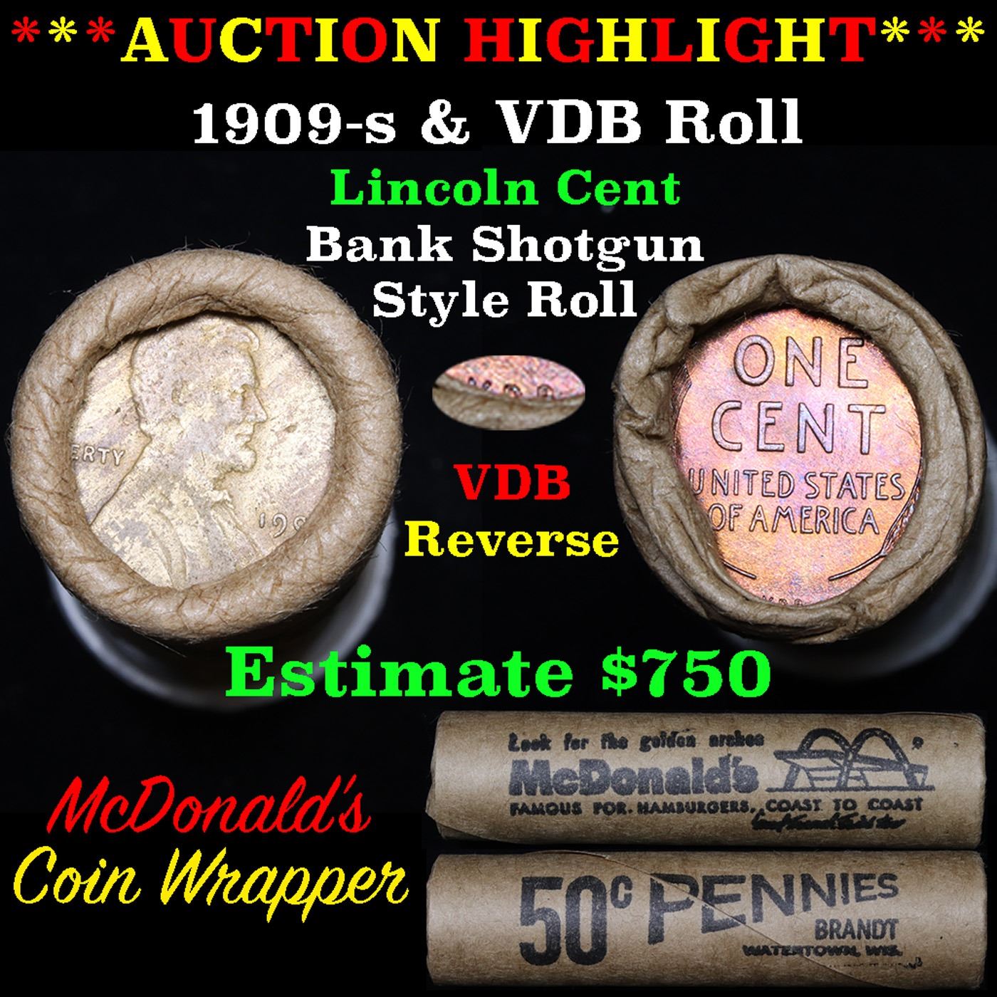 Lincoln Wheat cent 1c orig roll, 1909-s end, VDB other end Grades. Lincoln Wheat cent 1c original Shotgun Roll, 1909-s on one end, VDB reverse on the other. The roll is held in a Rare & Collectable McDonalds Brandt wrapper. Actual roll pictured is the roll you will get. A great original bank shotgun roll with very tight ends. From the feedback we have been receiving, people are happy with these rolls, nearly half the roll seems to be teens, all the rolls have a few Indians, most of the rolls have some steel cents, and a lot of the wheaties are mintmarks. These shotgun rolls are all from a new consignee. They are all frrom one Estate. This particular Roll shows a 1909-s on one end and a VDB reverse on the other end.