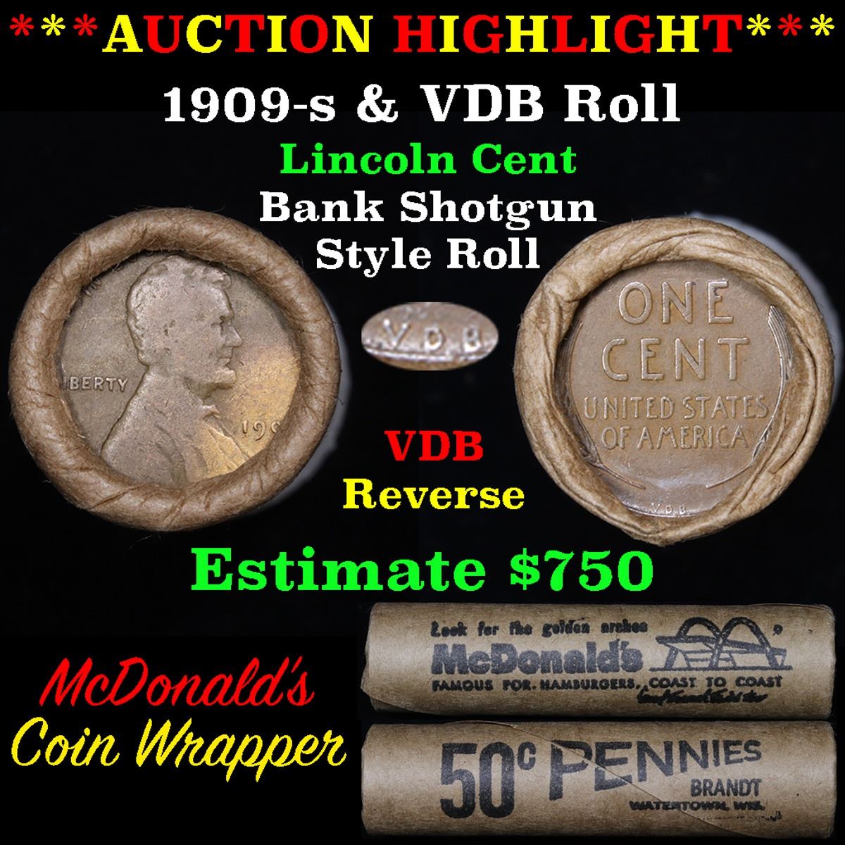 Lincoln Wheat cent 1c orig roll, 1909-s end, VDB other end. Lincoln Wheat cent 1c original Shotgun Roll, 1909-s on one end, VDB reverse on the other. The roll is held in a Rare & Collectable McDonalds Brandt wrapper. Actual roll pictured is the roll you will get. A great original bank shotgun roll with very tight ends. From the feedback we have been receiving, people are happy with these rolls, nearly half the roll seems to be teens, all the rolls have a few Indians, most of the rolls have some steel cents, and a lot of the wheaties are mintmarks. These shotgun rolls are all from a new consignee. They are all frrom one Estate. This particular Roll shows a 1909-s on one end and a VDB reverse on the other end.