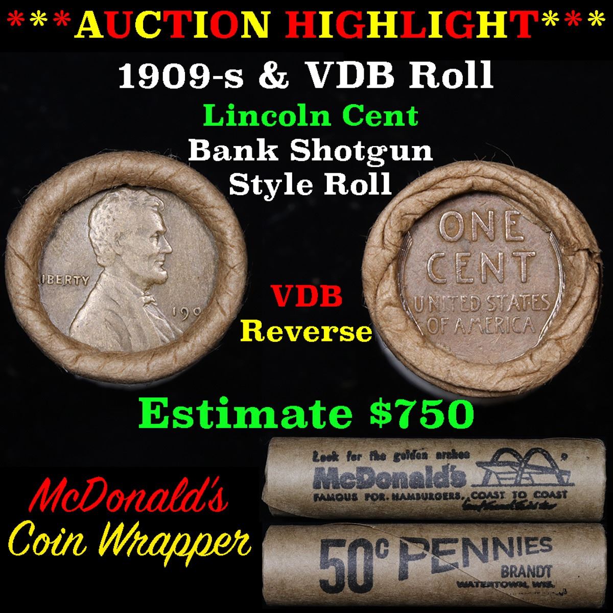 Lincoln Wheat cent 1c orig roll, 1909-s end, VDB other end. Lincoln Wheat cent 1c original Shotgun Roll, 1909-s on one end, VDB reverse on the other. The roll is held in a Rare & Collectable McDonalds Brandt wrapper. Actual roll pictured is the roll you will get. A great original bank shotgun roll with very tight ends. From the feedback we have been receiving, people are happy with these rolls, nearly half the roll seems to be teens, all the rolls have a few Indians, most of the rolls have some steel cents, and a lot of the wheaties are mintmarks. These shotgun rolls are all from a new consignee. They are all frrom one Estate. This particular Roll shows a 1909-s on one end and a VDB reverse on the other end.