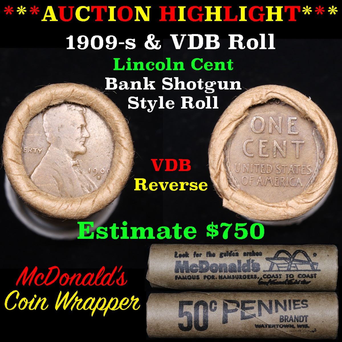 Lincoln Wheat cent 1c orig roll, 1909-s end, VDB other end. Lincoln Wheat cent 1c original Shotgun Roll, 1909-s on one end, VDB reverse on the other. The roll is held in a Rare & Collectable McDonalds Brandt wrapper. Actual roll pictured is the roll you will get. A great original bank shotgun roll with very tight ends. From the feedback we have been receiving, people are happy with these rolls, nearly half the roll seems to be teens, all the rolls have a few Indians, most of the rolls have some steel cents, and a lot of the wheaties are mintmarks. These shotgun rolls are all from a new consignee. They are all frrom one Estate. This particular Roll shows a 1909-s on one end and a VDB reverse on the other end.