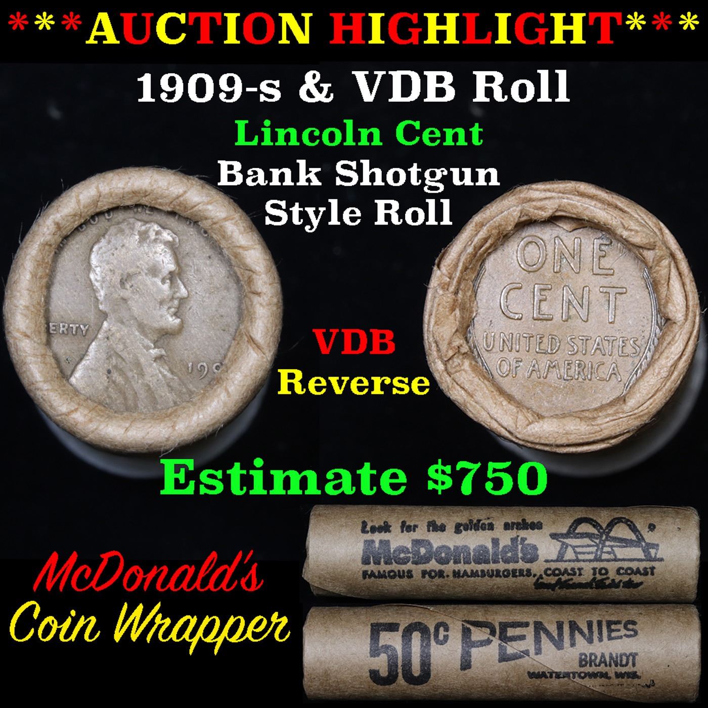 Lincoln Wheat cent 1c orig roll, 1909-s end, VDB other end. Lincoln Wheat cent 1c original Shotgun Roll, 1909-s on one end, VDB reverse on the other. The roll is held in a Rare & Collectable McDonalds Brandt wrapper. Actual roll pictured is the roll you will get. A great original bank shotgun roll with very tight ends. From the feedback we have been receiving, people are happy with these rolls, nearly half the roll seems to be teens, all the rolls have a few Indians, most of the rolls have some steel cents, and a lot of the wheaties are mintmarks. These shotgun rolls are all from a new consignee. They are all frrom one Estate. This particular Roll shows a 1909-s on one end and a VDB reverse on the other end.