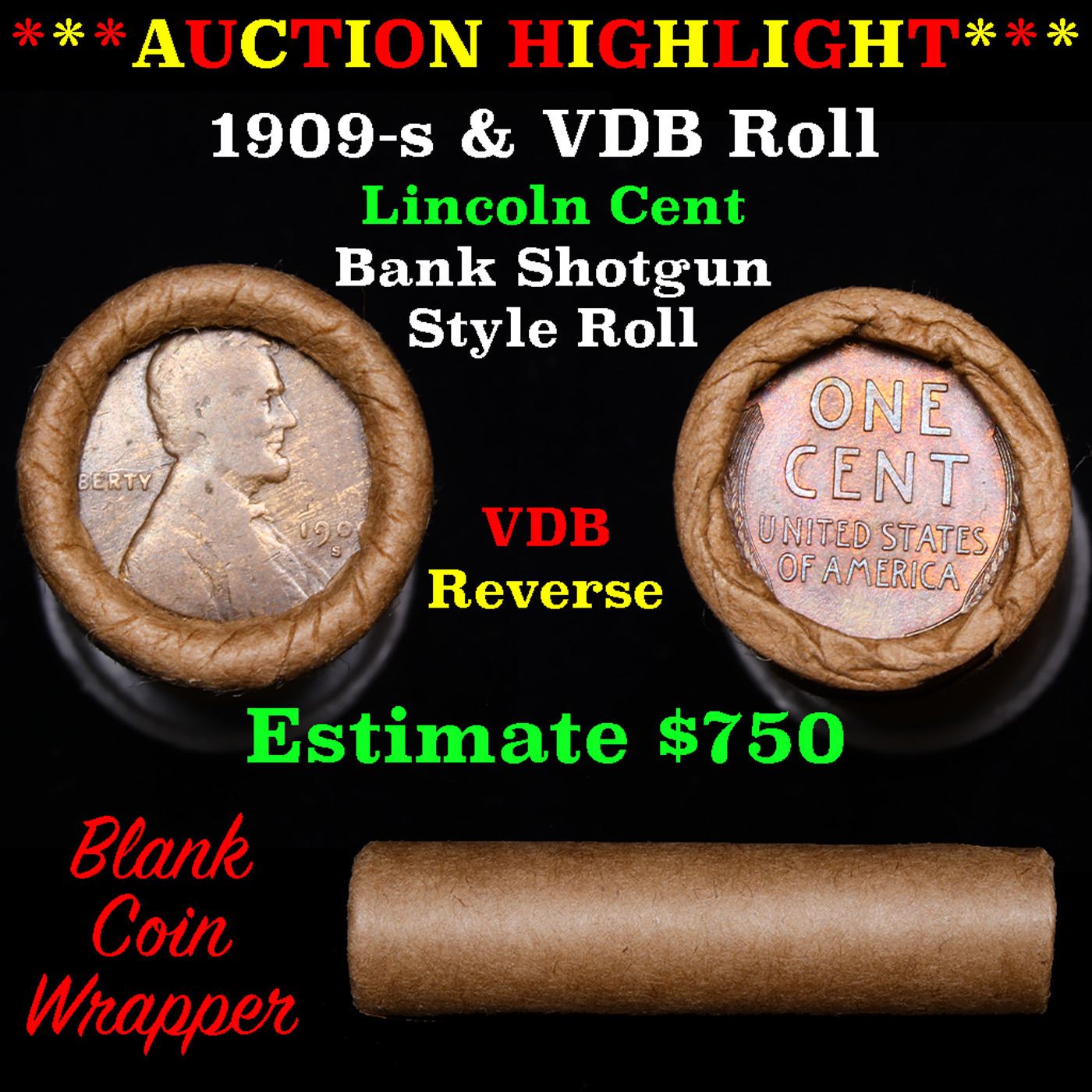 Lincoln Wheat cent 1c orig roll, 1909-s end, VDB other end. Lincoln Wheat cent 1c original Shotgun Roll, 1909-s on one end, VDB reverse on the other. The roll is held in a Rare & Collectable McDonalds Brandt wrapper. Actual roll pictured is the roll you will get. A great original bank shotgun roll with very tight ends. From the feedback we have been receiving, people are happy with these rolls, nearly half the roll seems to be teens, all the rolls have a few Indians, most of the rolls have some steel cents, and a lot of the wheaties are mintmarks. These shotgun rolls are all from a new consignee. They are all frrom one Estate. This particular Roll shows a 1909-s on one end and a VDB reverse on the other end.