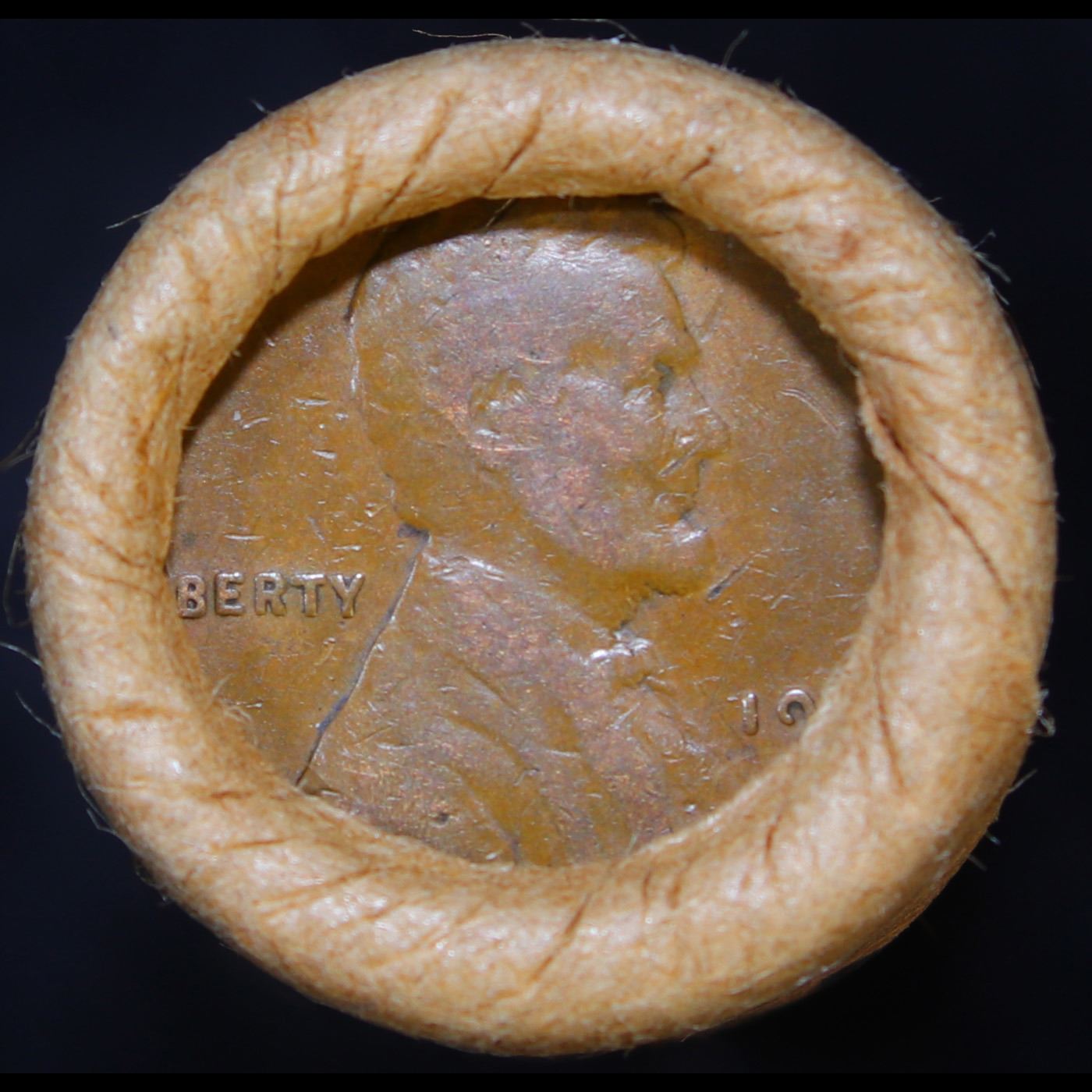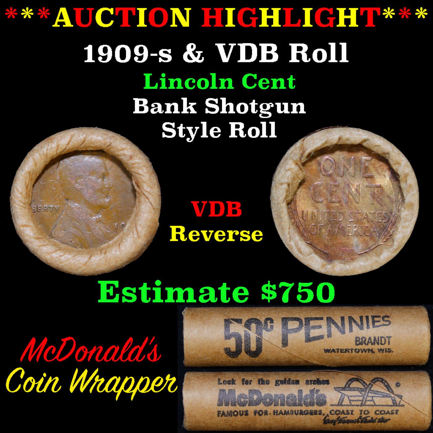 Lincoln Wheat cent 1c orig roll, 1909-s end, VDB other end. Lincoln Wheat cent 1c original Shotgun Roll, 1909-s on one end, VDB reverse on the other. Actual roll pictured is the roll you will get. A great original bank shotgun roll with very tight ends. From the feedback we have been receiving, people are happy with these rolls, nearly half the roll seems to be teens, all the rolls have a few Indians, most of the rolls have some steel cents, and a lot of the wheaties are mintmarks. These shotgun rolls are all from a new consignee. They are all frrom one Estate. This particular Roll shows a 1909-s on one end and a VDB reverse on the other end.