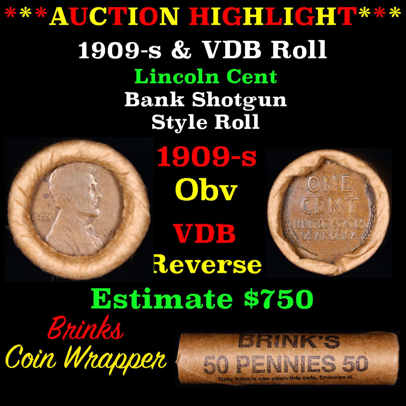 Lincoln Wheat cent 1c orig roll, 1909-s end, VDB other end. . Lincoln Wheat cent 1c orig roll, 1909-s end, VDB other end. Lincoln Wheat cent 1c original Shotgun Roll, 1909-s on one end, VDB reverse on the other. The roll is held in a Rare & Collectable Brandtwrapper. Actual roll pictured is the roll you will get. A great original bank shotgun roll with very tight ends. From the feedback we have been receiving, people are happy with these rolls, nearly half the roll seems to be teens, all the rolls have a few Indians, most of the rolls have some steel cents, and a lot of the Wheaties are mintmarks. These shotgun rolls are all from a new consignee. They are all from one Estate. This particular Roll shows a 1909-s on one end and a VDB reverse on the other end