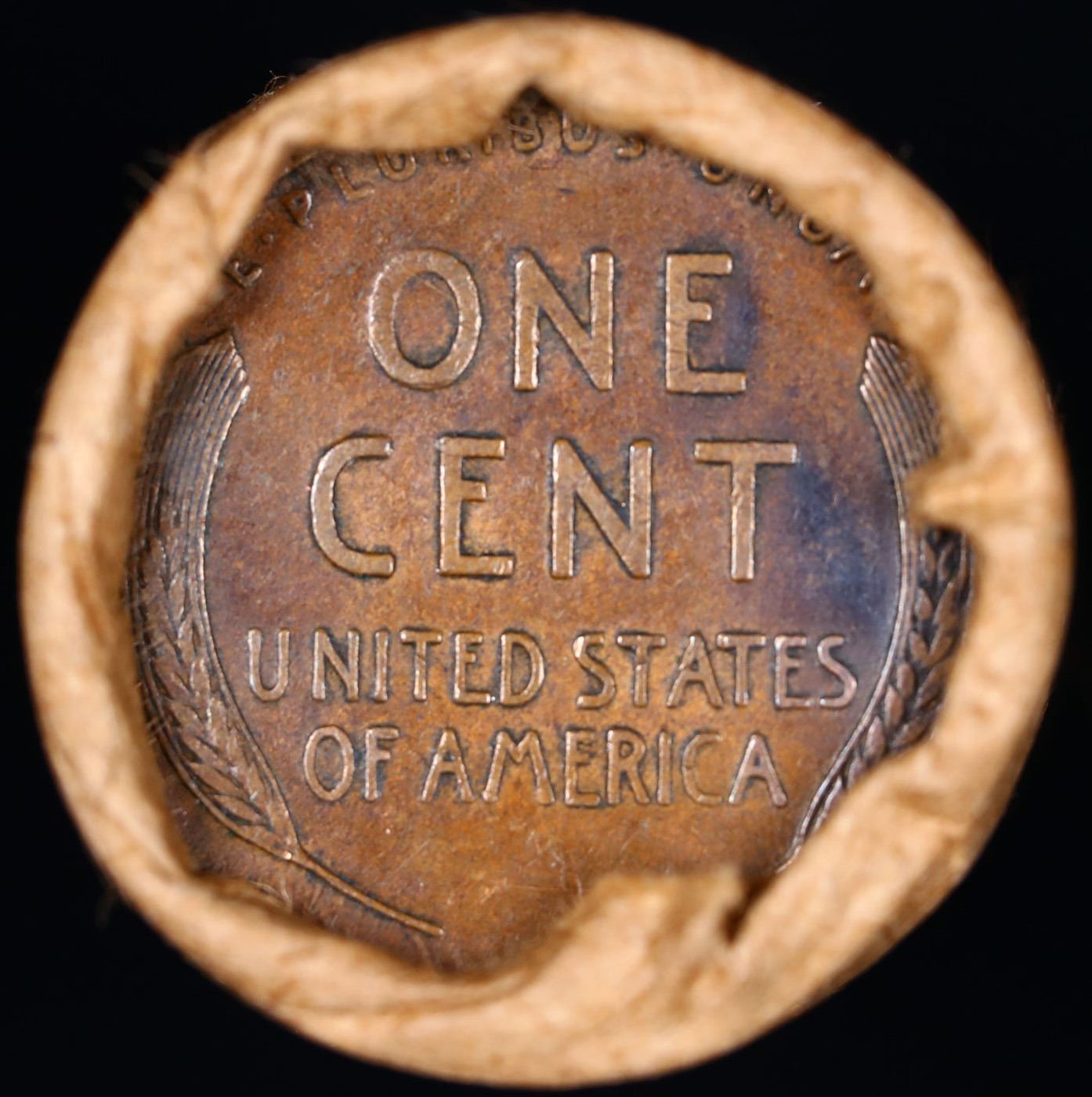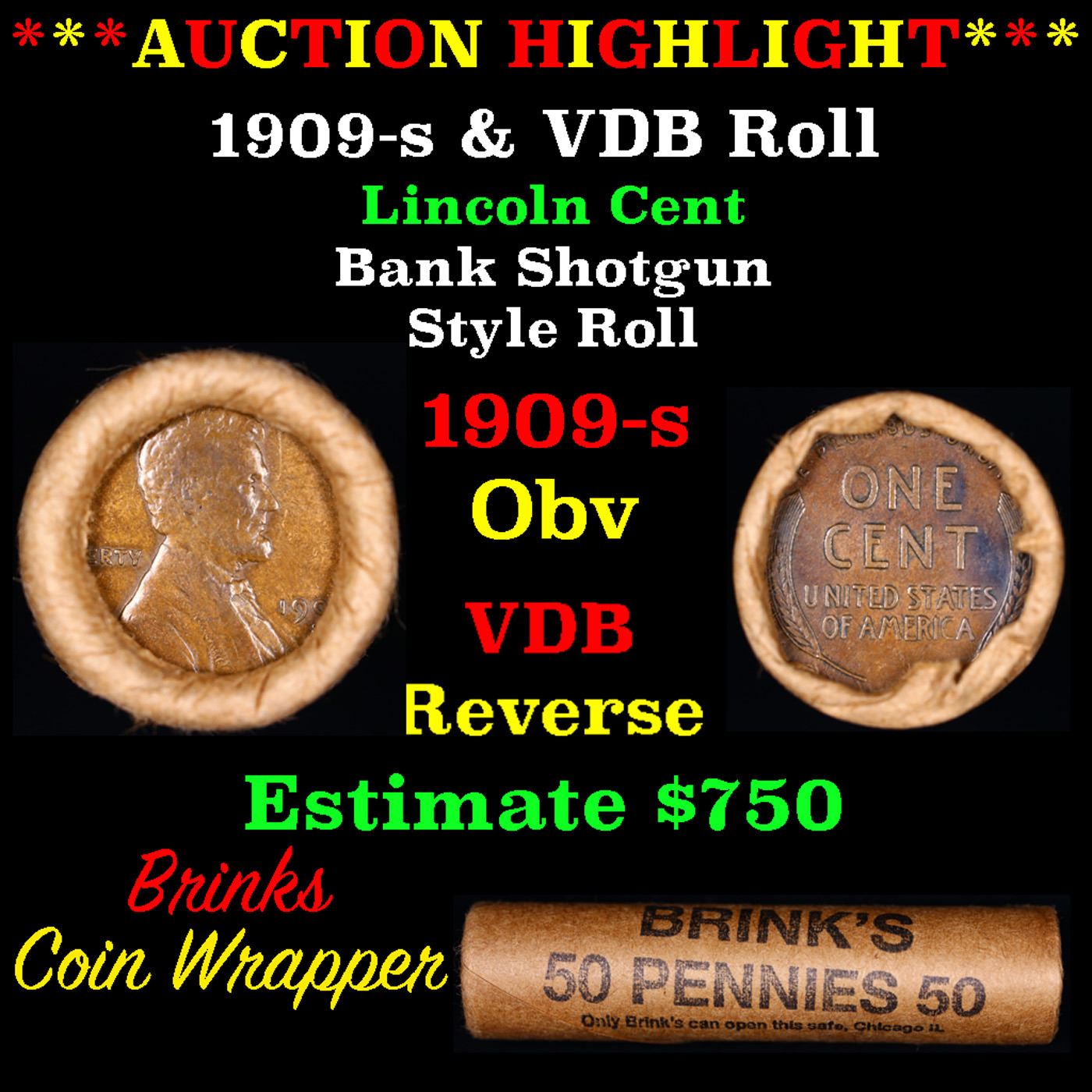 Lincoln Wheat cent 1c orig roll, 1909-s end, VDB other end. . Lincoln Wheat cent 1c orig roll, 1909-s end, VDB other end. Lincoln Wheat cent 1c original Shotgun Roll, 1909-s on one end, VDB reverse on the other. The roll is held in a Rare & Collectable Brandtwrapper. Actual roll pictured is the roll you will get. A great original bank shotgun roll with very tight ends. From the feedback we have been receiving, people are happy with these rolls, nearly half the roll seems to be teens, all the rolls have a few Indians, most of the rolls have some steel cents, and a lot of the Wheaties are mintmarks. These shotgun rolls are all from a new consignee. They are all from one Estate. This particular Roll shows a 1909-s on one end and a VDB reverse on the other end