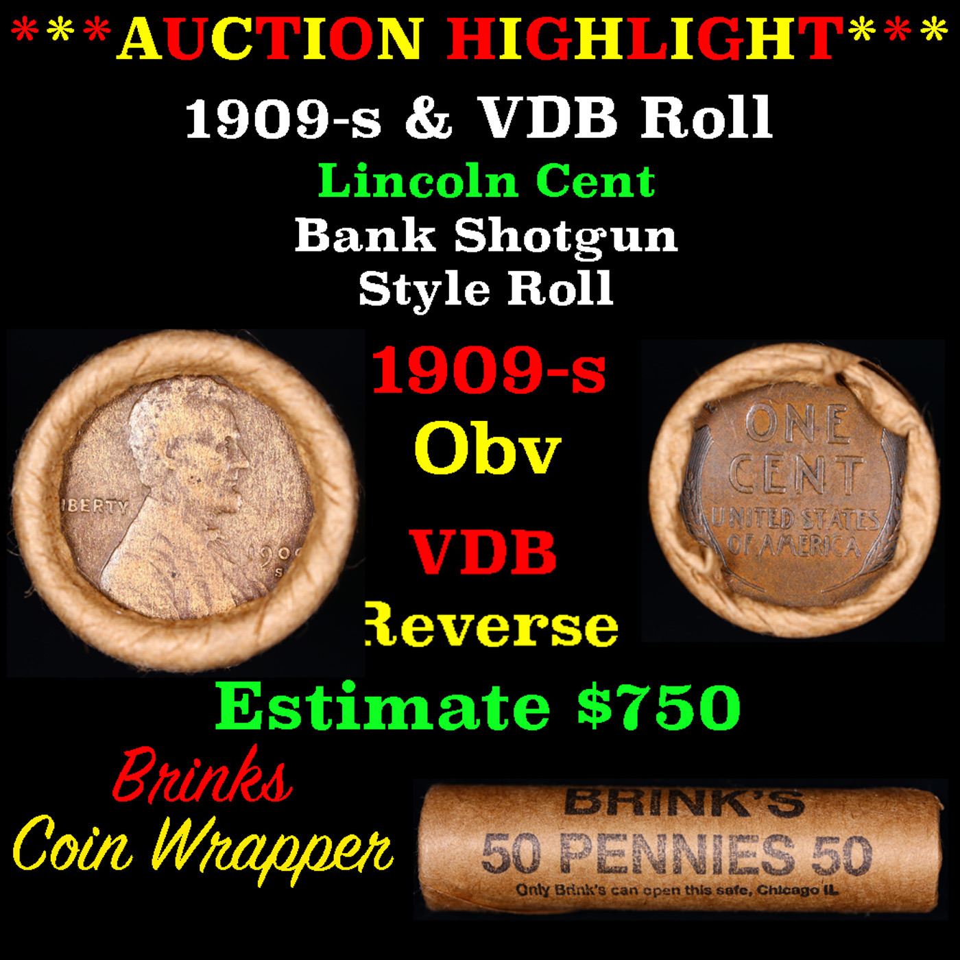 Lincoln Wheat cent 1c orig roll, 1909-s end, VDB other end. . Lincoln Wheat cent 1c orig roll, 1909-s end, VDB other end. Lincoln Wheat cent 1c original Shotgun Roll, 1909-s on one end, VDB reverse on the other. The roll is held in a Rare & Collectable Brandtwrapper. Actual roll pictured is the roll you will get. A great original bank shotgun roll with very tight ends. From the feedback we have been receiving, people are happy with these rolls, nearly half the roll seems to be teens, all the rolls have a few Indians, most of the rolls have some steel cents, and a lot of the Wheaties are mintmarks. These shotgun rolls are all from a new consignee. They are all from one Estate. This particular Roll shows a 1909-s on one end and a VDB reverse on the other end