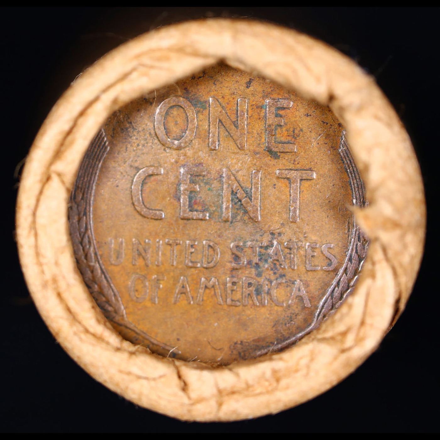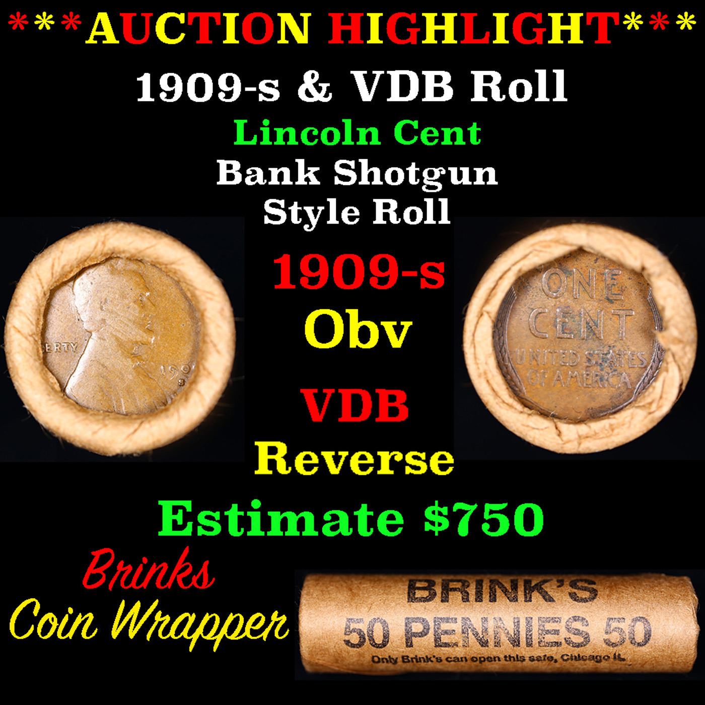 Lincoln Wheat cent 1c orig roll, 1909-s end, VDB other end. . Lincoln Wheat cent 1c orig roll, 1909-s end, VDB other end. Lincoln Wheat cent 1c original Shotgun Roll, 1909-s on one end, VDB reverse on the other. The roll is held in a Rare & Collectable Brandtwrapper. Actual roll pictured is the roll you will get. A great original bank shotgun roll with very tight ends. From the feedback we have been receiving, people are happy with these rolls, nearly half the roll seems to be teens, all the rolls have a few Indians, most of the rolls have some steel cents, and a lot of the Wheaties are mintmarks. These shotgun rolls are all from a new consignee. They are all from one Estate. This particular Roll shows a 1909-s on one end and a VDB reverse on the other end