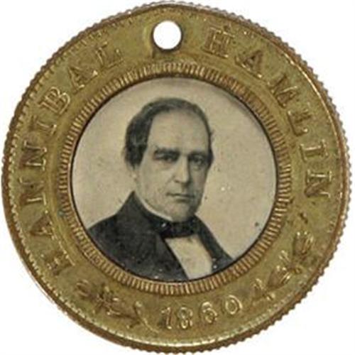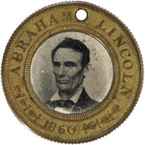 <B>Lincoln and Hamlin Campaign Ferrotype.</B></I> A 25mm. solid brass political from 1860, a back-to-back medal with photographs of the Republican standard-bearers. The Lincoln side is just a tad darker than the Hamlin which is bright and resonant. Holed at top for suspension, a superior example of an increasingly difficult item to source.<BR><BR><b>Shipping:</b> Miscellaneous Collectibles, Smal (<a target="_blank" href="http://www.heritageauctions.com/common/shipping.php">view shipping information</a>)