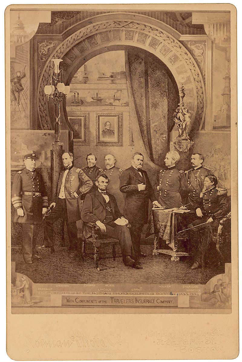 Original 4.25 x 6.5 cabinet composite photo of Lincoln with eight Civil War generals, including Grant, Farragut, Sherman, Hooker, and Sheridan. Published by Notman of Boston circa 1884. In fine condition.