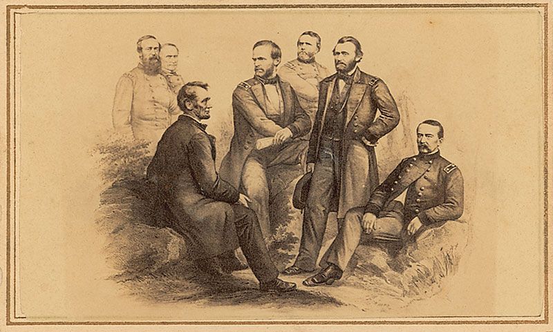 Original 3.75 x 2.25 carte-de-visite of an illustration depicting Lincoln with a group of Union commanders, including Grant, Sherman, Sheridan, Farragut, and Porter. In fine condition.