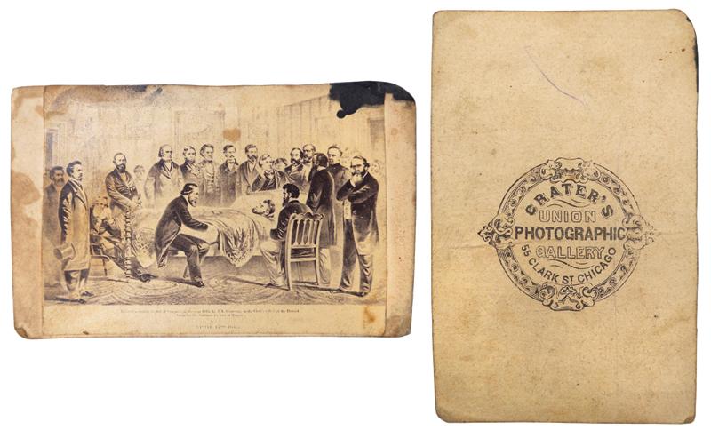 Lincoln death-bed carte de visite, faint lettering reads "Entered according to act of Congress in the year 1865 by J.L. Campbell….April 15, 1865", back of card reads "Craters Union Photographic Gallery-Chicago", Campbell's scene gives Edwin Stanton, Lincoln's War Secretary, at front right, an unusual prominence as he stands almost facing the viewer, Good cond w/some stain, 2 3/8"H x 3 5/8"W.