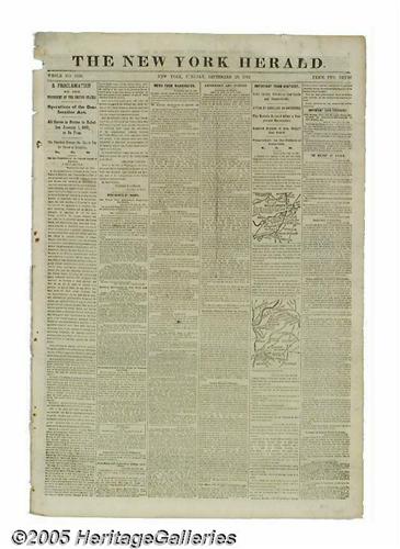 <B>Lincoln's Landmark Emancipation Proclamation, September 23, 1862 "New York Herald"</B></I> The <I>New York Herald</B></I> was published by James Gordon Bennett. It was one of the finest of all period papers in the full and accurate reporting of the Civil War, employing 63 war correspondents. This issue is one of the most important of all that he published: a front page, column one printing of Abraham Lincoln's Emancipation Proclamation. Lincoln had avoided freeing slaves in the Confederate states believing that the war was being fought to preserve the Union. On August 22, 1862, he wrote (to Horace Greeley): <I>"If I could save the Union without freeing any slave, I would do it; and if I could save it by freeing all the slaves, I would do it; and if I could do it by freeing some and leaving others alone, I would also do that."</B></I> He had already chosen the third course and was waiting for a decisive Union victory before issuing the Proclamation. Antietam gave him this opportunity and, on September 22nd, he released this preliminary version. On January 1, 1863, the formal and definite Emancipation Proclamation was issued. The President, by virtue of his powers as commander-in-chief, declared free all those slaves residing in territory in rebellion against the federal government <I>"as a fit and necessary war measure for suppressing said rebellion."</B></I> The entire act is printed on page one under a headline of <I>A PROCLAMATION BY THE PRESIDENT OF THE UNITED STATES... All Slaves in States in Rebellion January 1, 1863 to Be Free</B></I> and signed in type by Lincoln. The importance of this act cannot be overstated and this is a first printing in an important New York paper the day after it happened. The front page also has two maps and reports of the campaigns in Kentucky. Eight pages, 15.5" x 22.5" in size. Very fine condition, clean and bright, disbound but attached at the spine. A worthy addition to any collection. Lot:251