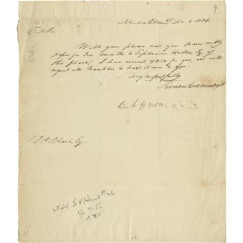 <B>Secretary of War Under Lincoln, Simon Cameron Autograph Letter Signed</B></I> “<I>Simon Cameron</B></I>”. One page, 7.75” x 9”, Middletown PA , December 8, 1834, in ink, to Frank P. Blair. Simon Cameron (1799-1889) was a distinguished American politician and businessman from Pennsylvania. The letter has the usual fold creases, is slightly toned with age, but is otherwise very good. <BR><BR><b>Shipping:</b> Flat Material, Small (<a target="_blank" href="http://www.heritageauctions.com/common/shipping.php">view shipping information</a>)