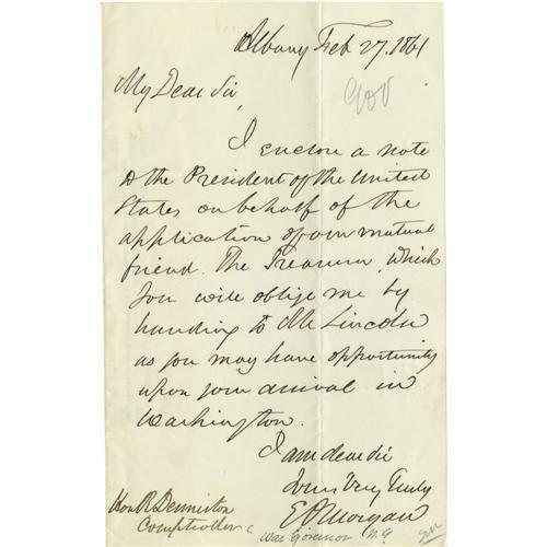 <B>[Abraham Lincoln] Edwin D. Morgan: Letter of the Lincoln Cabinet Appointee Who Wouldn't Serve Autograph Letter Signed</B></I> as Governor of New York, 1 page, 5" x 8", Albany, February 27, 1861. To New York Comptroller Robert Denniston. In very fine condition, albeit with a couple of pencil dealer's notations, and minor mounting traces on verso of the docketed integral leaf. <BR><BR>Great collectors are nothing if not comprehensive -- and so the person who collects this letter will be a great Lincoln collector indeed, for here is the autograph of a man, though appointed by the President to be Secretary of the Treasury, refused to serve. Edward Morgan, then a Senator from New York, first heard the appointment as it was being read on the Senate floor on February 13, 1865. "<I>I was appointed to the position once during Mr. Lincoln's administration," he recalled, "without being consulted at all. It was to succeed Senator [William P.] Fessenden, and no one was more surprised than myself to hear the appointment read when it was sent to the Senate for approval. I asked them to lay the matter over until I should return, and then drove to the White House and represented to Mr. Lincoln, that for many reasons, I could not accept the position, and the appointment was withdrawn</B></I>." This autograph letter is not about the infamous incident, but does mention Lincoln twice, and "The Treasurer", once. "<I>I enclose a note to the President of the United States on behalf of the application of our mutual friend, The Treasurer, which you will oblige me by handing to Mr. Lincoln as you may have opportunity upon your arrival in Washington</B></I>." From the Henry E. Luhrs Collection. Accompanied by LOA from PSA/DNA.
