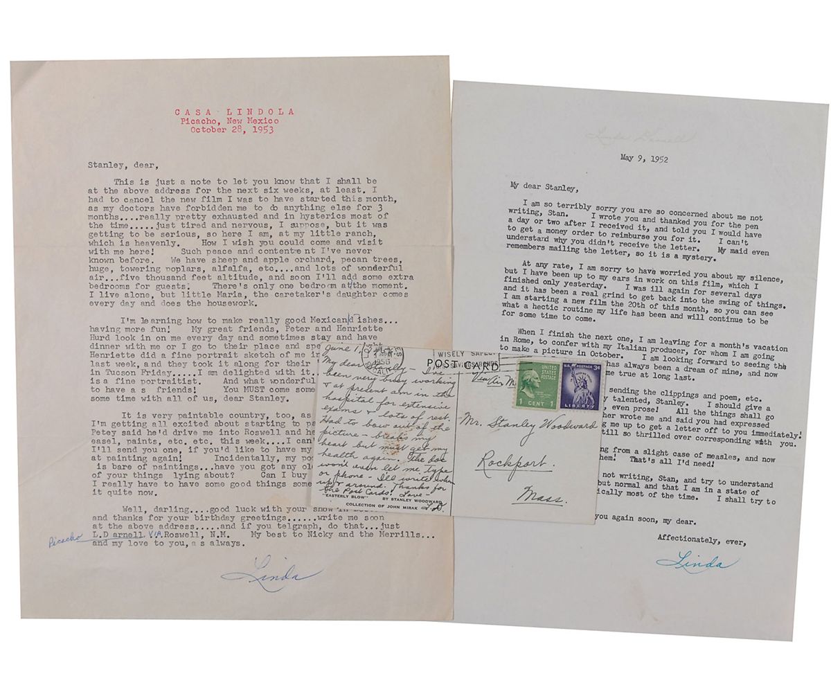 Three letters to Stanley Woodward: TLS signed “Linda,” one page, 7.25 x 10.5, personal letterhead, May 9, 1952, in part: “I have been up to my ears in work on this film, which I finished only yesterday.”; TLS signed “Linda,” one page, 8.5 x 11, personal letterhead, October 28, 1953, in part: “I had to cancel the new film I was to have started this month, as my doctors have forbidden me to do anything else for 3 months.”; and an ALS signed “L. D.,” one page on a 5.5 x 3.25 postcard, postmarked June 4, 1956, again regarding her health. In overall very good to fine condition. Accompanied by the original mailing envelope for one letter.