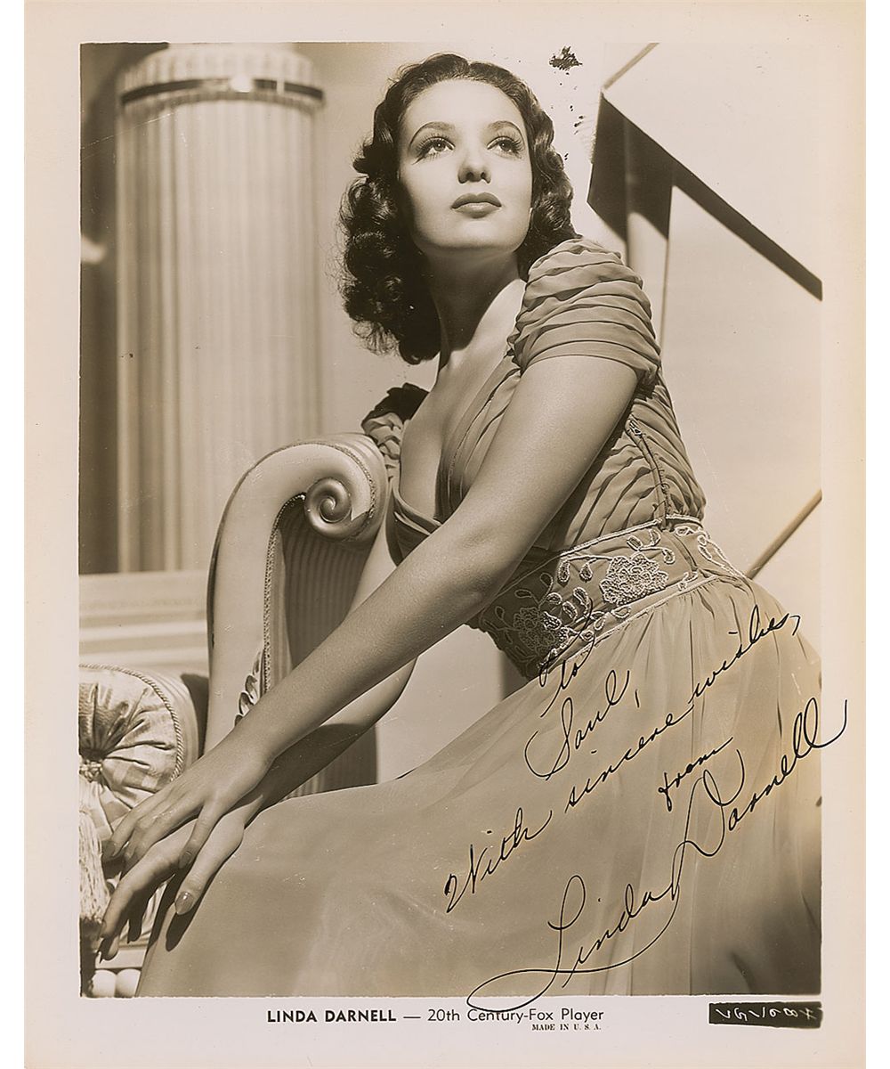 Vintage glossy 8 x 10 20th Century Fox publicity photo of Darnell in a bust dress, signed and inscribed in person in fountain pen, “To Saul, With sincere wishes, from Linda Darnell.” In fine condition, with mild haloing to signature and inscription.