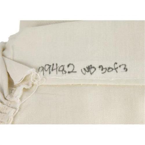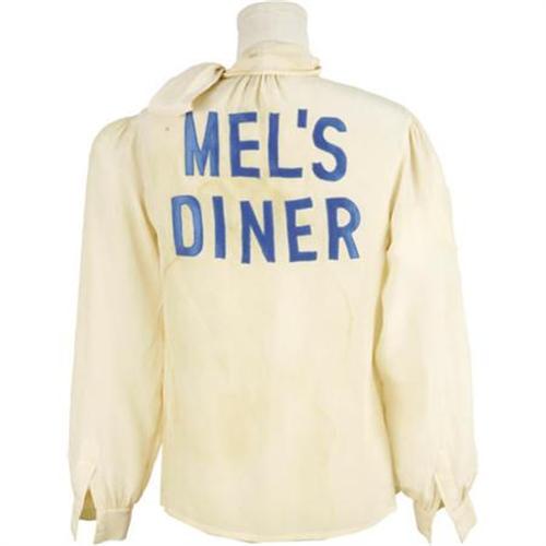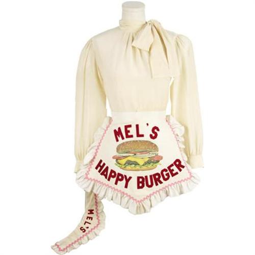 <B>Linda Lavin Screen-Worn Costume from "Alice."</B></I> Alice Hyatt's creme silk blouse with sky-blue lettering en verso advertising Mel's Diner as worn by actress Linda Lavin on <I>Alice</B></I> (1976-85). Also in this lot, a whimsical "Mel's Happy Burger" apron featuring a heat-transferred image of a sloppy burger and a matching hat as worn during special promotions at Mel's diner. Acquired from Warner Bros. Studios, where the series was shot. <I>Authenticated by the world's foremost curators of television artifacts, The Comisar Collection of Beverly Hills.</B></I><BR><BR><b>Shipping:</b> Clothing, Costumes & Jerseys (<a target="_blank" href="http://www.heritageauctions.com/common/shipping.php">view shipping information</a>)