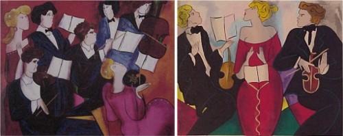 TROP OF MUSICIANS, screenprint, signed in pencil artist’s proof 50, image 9 ½ x 11 ½”, framed with glass; ACCORDS, screenprint, signed in pencil, image 15 ½ x 20”, full margins, framed with glass. (2) $100/200