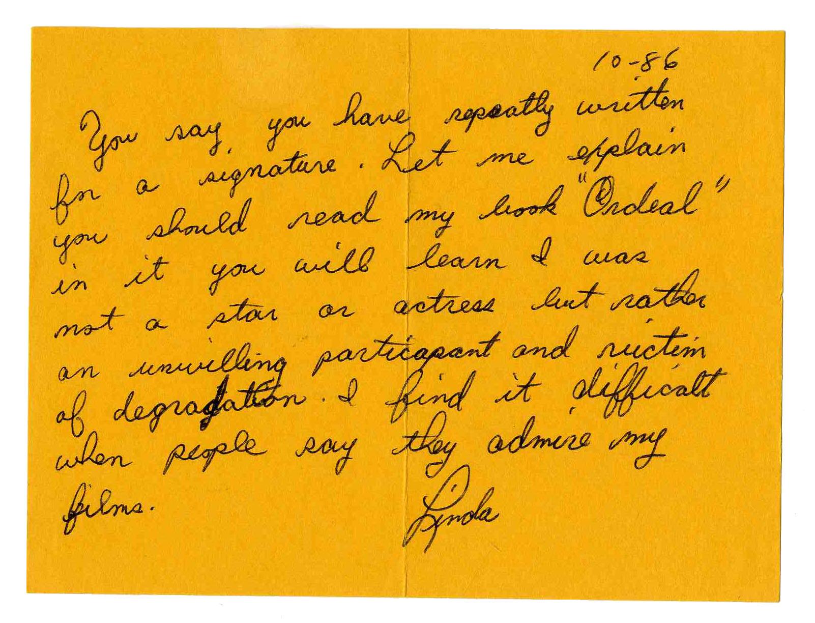 Autograph letter signed by Linda Lovelace, star of the adult film ''Deep Throat,'' here expresses her true feelings upon the industry that made her famous. Dated October 1986, letter reads: ''You say you have repeatly written for a signature. Let me explain you should read my book 'Ordeal' in it you will learn I was not a star or actress but rather an unwilling participant and victim of degradation. I find it difficult when people say they admire my films. Linda.'' Black ink on yellow paper measuring 5'' x 3.75''. Near fine condition.