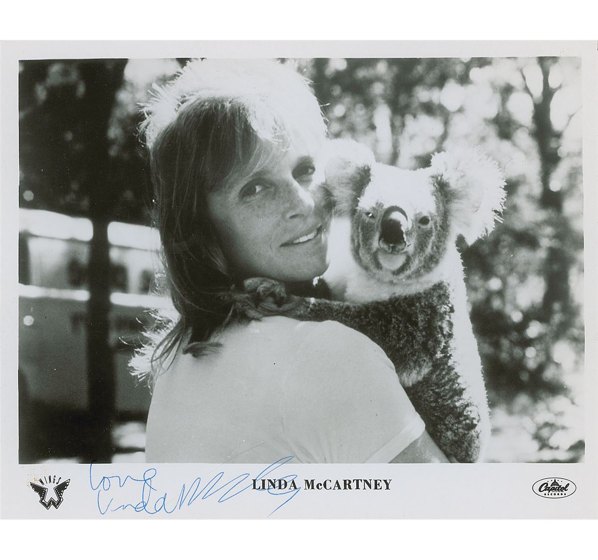 Glossy 10 x 8 Capitol Records Wings publicity photo of McCartney holding a koala, signed in the lower border in blue ballpoint, “Love, Linda McCartney.” In fine condition, with a trivial spot of soiling to lower left corner.