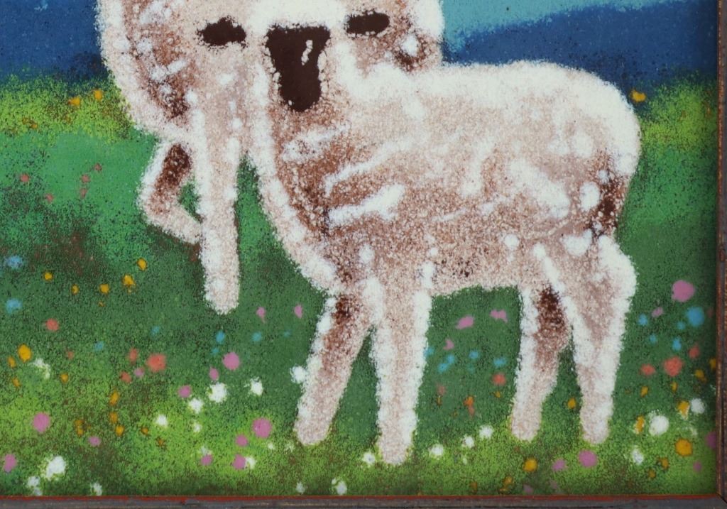 Featured in this lot is this original Linda Pond enamel on copper circa 1990s. Linda Pond is an American artist known for her colorful enamel paintings on glass, copper and more. This original painting is set in a shadowbox style frame constructed of wood and canvas. The painting shows a woman in a yellow and blue dress holding a baby sheep while three other sheep stand around her. She is standing in a field of grass and flowers with a beautiful mountain scene behind here, showing colors of blue, purple, pink, teal and light blue. The painting and frame show good condition overall with no signs of major wear or damage present. The visible art measures 4 9/16" L x 6 5/8" W, while the entire piece measures 10" L x 12" W x 1 1/4" D.