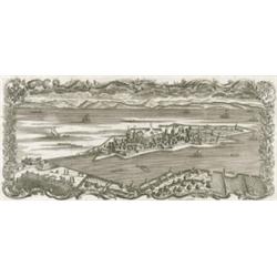 Lindau mit der Bregenzer Bucht und dem Bregenzer Wald. Gesamtansicht aus der Vogelschau und Standpunkt über dem Aeschacher Ufer. Kupferstich von G. I. Ostertag, um 1750. - (Schefold 46053). Mit dem Namenszug des Stechers in der Platte. Qu.-4<SUP>o</SUP>. Schwach angeschmutzt, mit winzigen restaurierten Einrissen und stellenweise schwach berieben. Zweifach gefaltet.