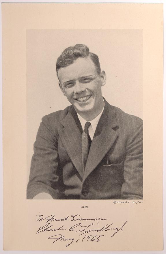 Lindbergh, Charles A (1902-74) Pioneer aviator; in 1927 he became the first person to fly nonstop across the Atlantic. Photograph from a publication with original inscription and signature, "To Mark Timmons / Charles A. Lindbergh / May, 1965," 8x5". The smiling photo shows Lindbergh as a young man; his nickname, "Slim" is below the photo which was taken by Donald E. Keyhoe. Fine.