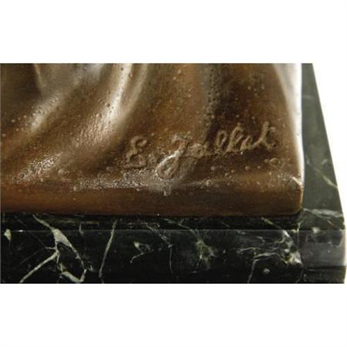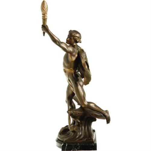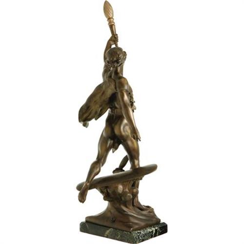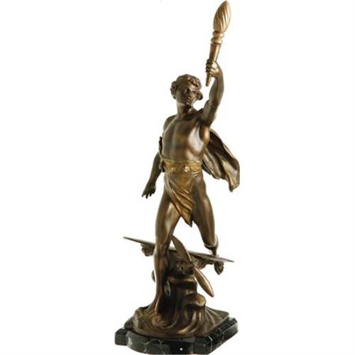 <B>Lindbergh Flight Commemorative Bronze Statuette,</B></I> artist-signed “E. Jollet”, marked as Made in France, hollow cast with applied coppery patina, overall 21.25” including 1” dark green marble base with rounded front, depicted is a male personification of Progress striding over a foamy sea with torch in hand. Below this classically inspired Art Deco figure is Charles Lindbergh's <I>Spirit of St. Louis.</B></I> Oddly, the plane is riding the crest of a wave like a California surfboard. Casting flaws as made, the most noticeable being a 1” split in the “water”. A drill hole at back of base and another in the torch indicate this sculpture was originally wired as a lamp. Excellent condition.<BR><BR><b>Shipping:</b> Miscellaneous Collectibles, Smal (<a target="_blank" href="http://www.heritageauctions.com/common/shipping.php">view shipping information</a>)