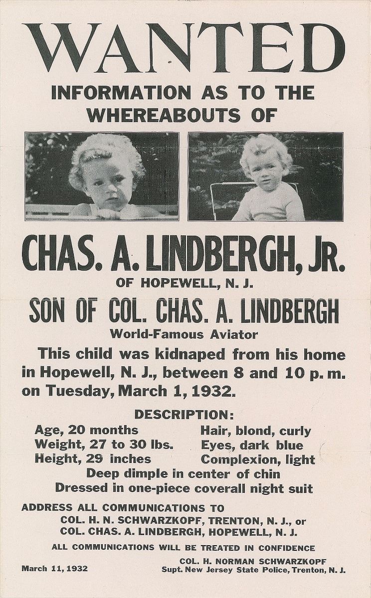 Wanted poster seeking information in the aftermath of the Lindbergh baby kidnapping, 9.5 x 16, March 11, 1932. The poster features two images of the child and is headed, “Wanted: Information as to the whereabouts of Chas. A. Lindbergh, Jr., of Hopewell, N.J., son of Col. Chas. A. Lindbergh, World-Famous Aviator.” In fine condition, with intersecting folds and light handling wear.