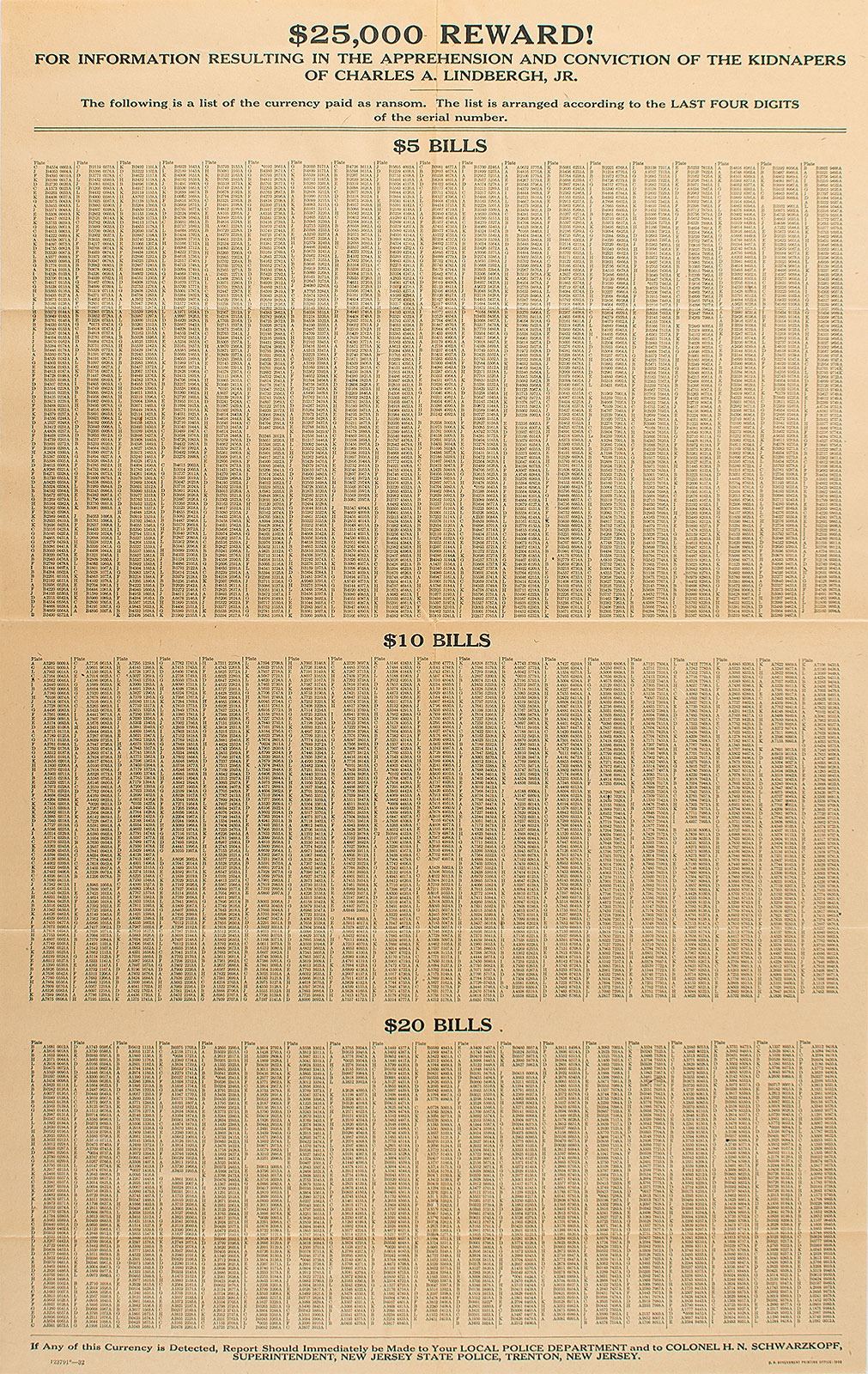 Uncommon reward poster offering $25,000 for "information resulting in the apprehension and conviction of the kidnappers of Charles A. Lindbergh, Jr.," 17 x 27, listing numerous serial numbers of the 5, 10, and 20 dollar bills used in the $50,000 ransom payment. Poster requests that any detected currency be communicated to the local police and Col. H. Norman Schwarzkopf. In fine condition, with splitting to the top of the vertical fold.