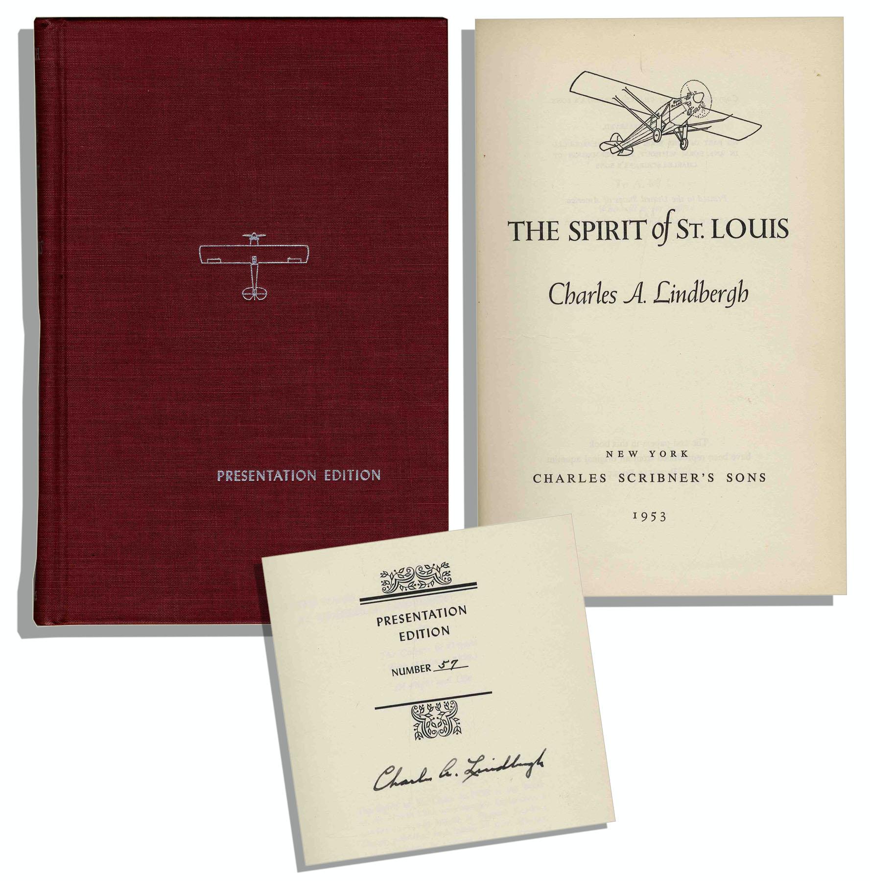 Charles Lindbergh signed presentation copy of his Pulitzer Prize winning memoir, ''The Spirit of St. Louis.'' New York: Charles Scribner's Sons: 1953. Limited edition signed in bold black ink by Lindbergh and numbered 57. Silver airplane and ''Presentation Edition'' stamped to front cover; silver titling and author's name to backstrip. 561pp. octavo hardcover with original red boards is illustrated with 16 pages of photographs, double-page map of the flight and mechanical diagrams of the plane. Lindbergh's gripping account of his historic nonstop transatlantic flight won him the Pulitzer Prize for autobiography in 1954. With private bookplate of famed collector James Copley, friend of Charles Lindbergh, on the front pastedown. Light shelf wear and ''Lindbergh'' written twice in pencil on signature page, else near fine. Overall, a handsome copy of the book Time Magazine said, ''keeps the reader cockpit-close to a rare adventure.''