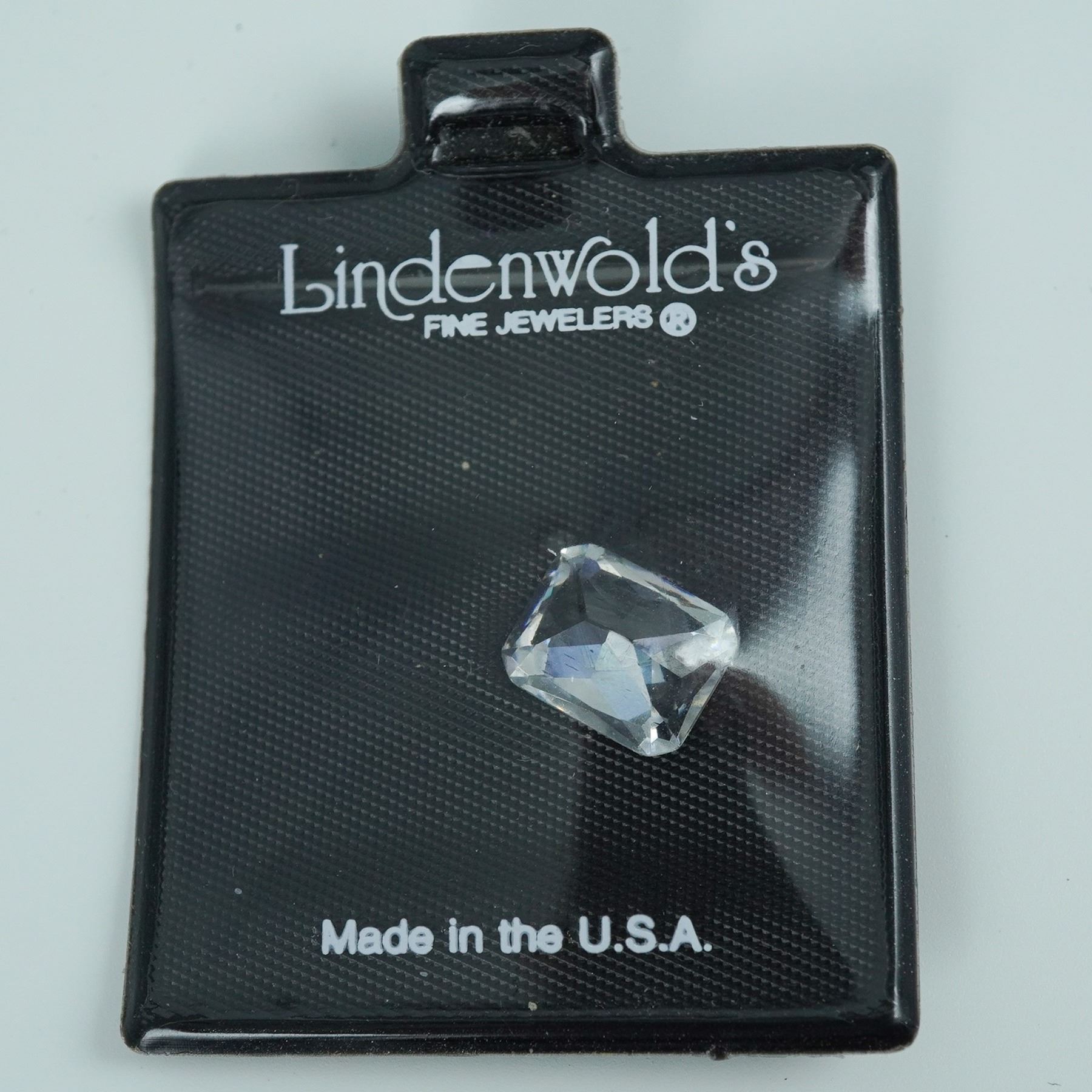 A faceted colorless gemstone from Lindenwold's Fine Jewelers, likely a synthetic or simulated diamond, presented in a rectangular brilliant cut. The stone exhibits high clarity and reflective brilliance, ideal for mounting in custom jewelry or as a collector's display piece. Housed in original display packaging marked Made in the U.S.A.