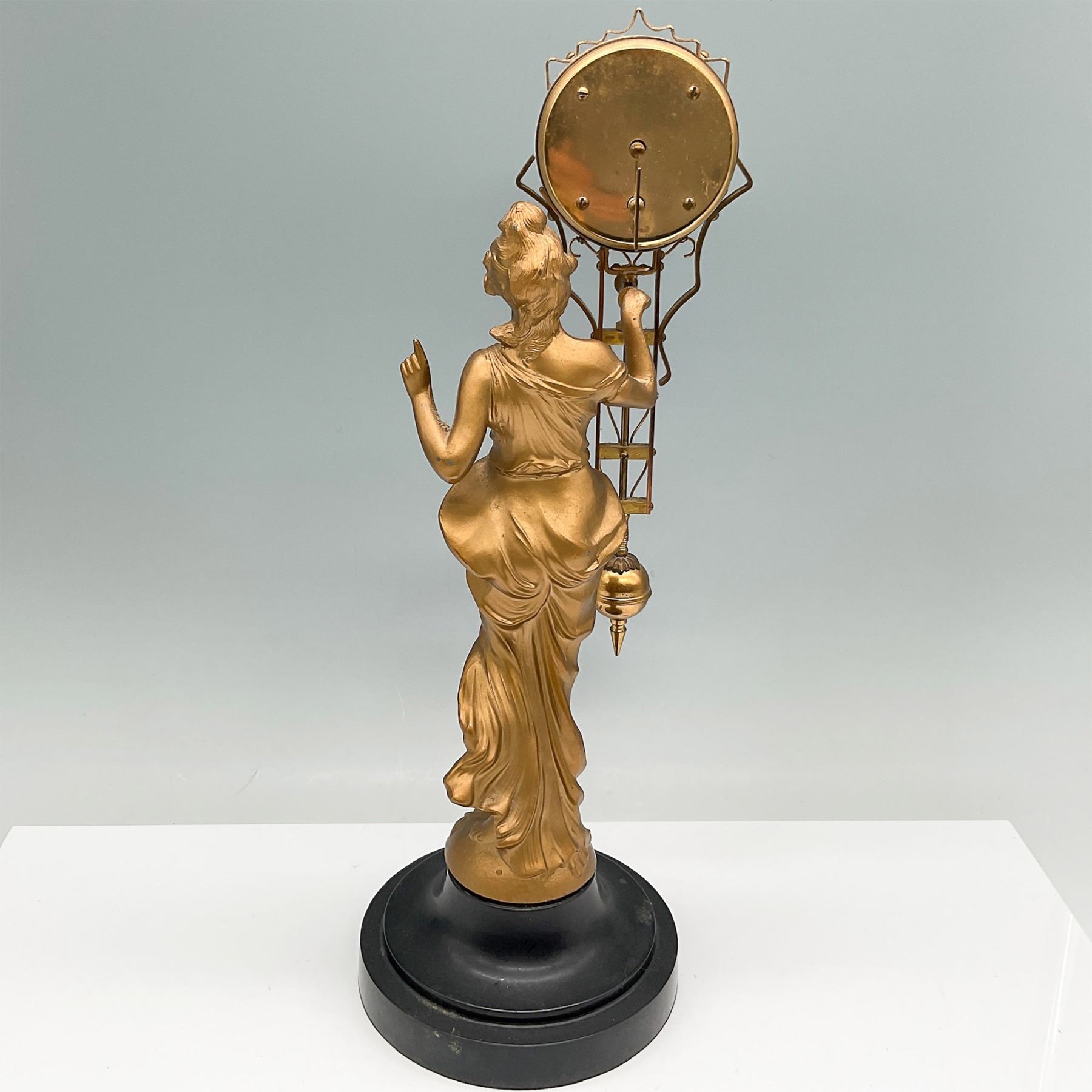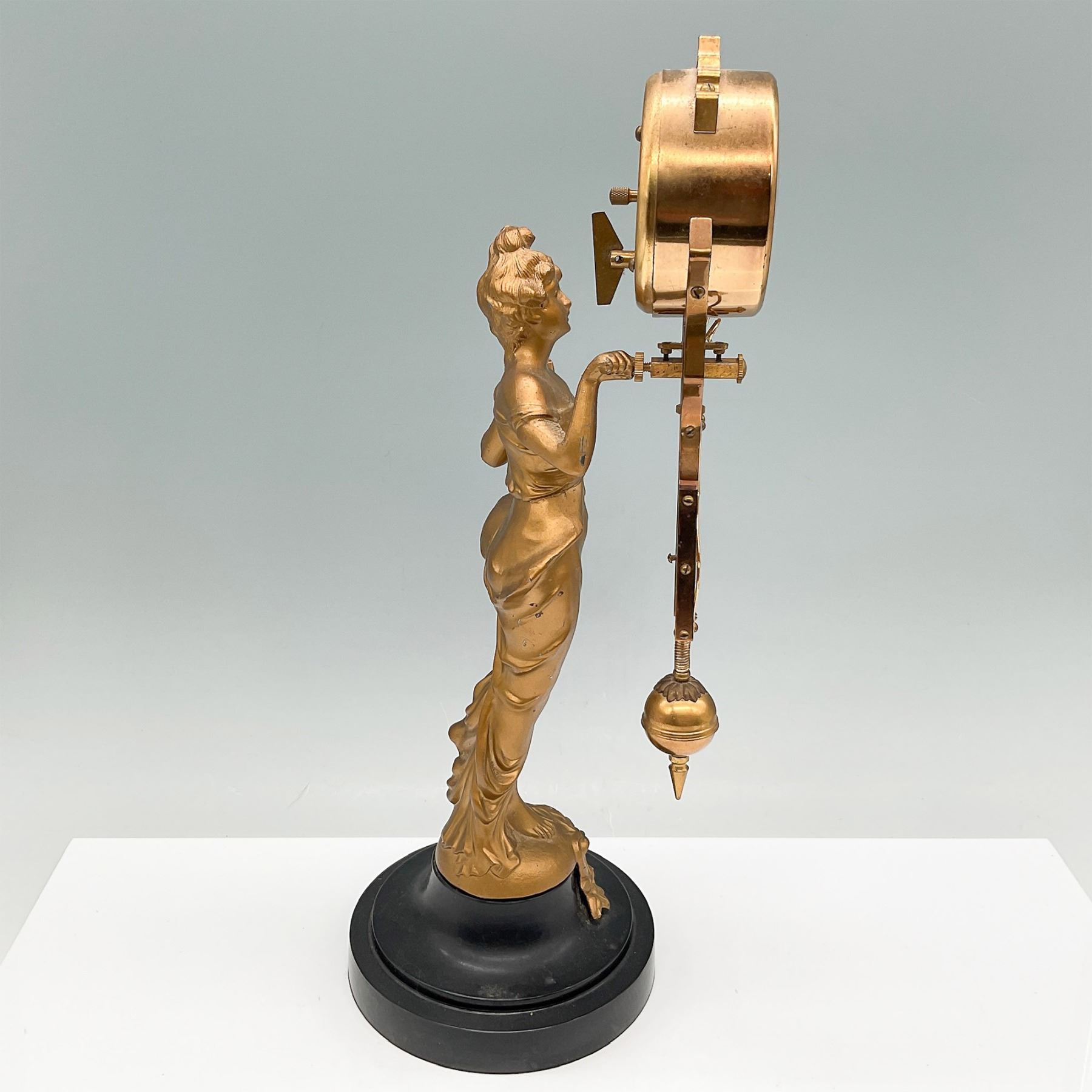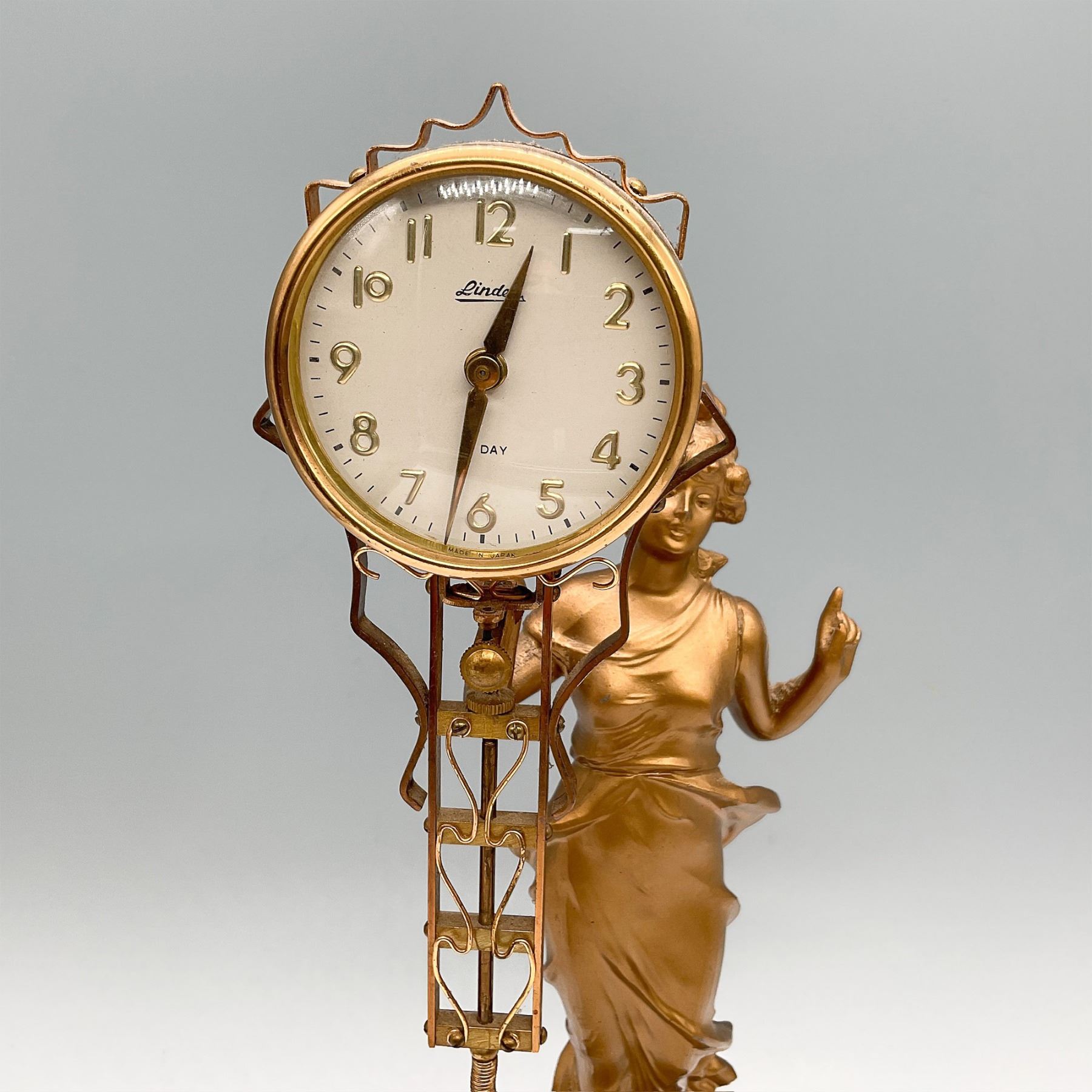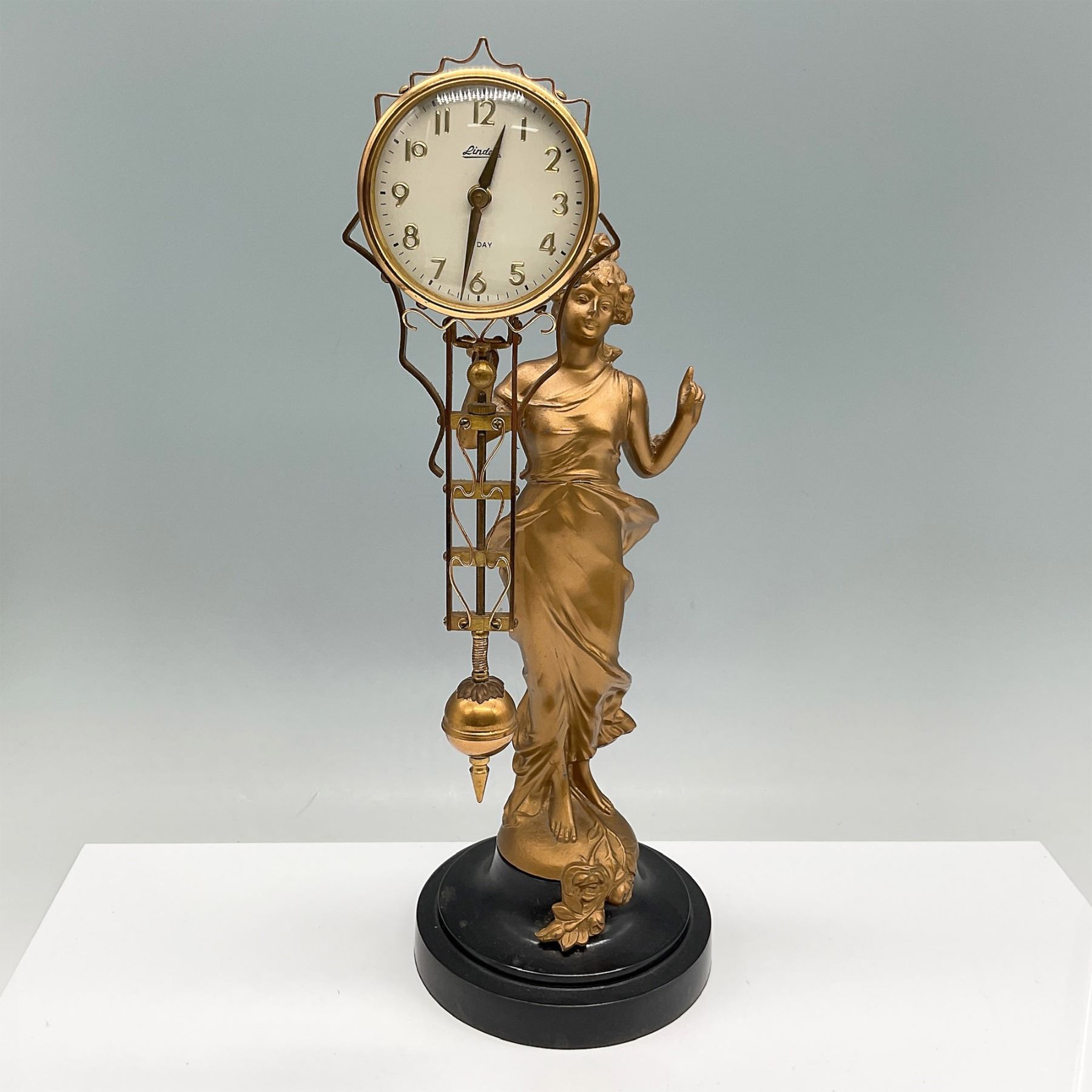 Vintage Linder 8-day swinging arm mantel clock featuring an elegant gilt female figure in neoclassical attire, standing on a round black base. The clock face is suspended above the figure by an ornate metal frame, with a swinging pendulum extending downward. The clock has a white dial with Arabic numerals, gold-tone hands, and the Linder brand name. This charming timepiece embodies Art Nouveau influences, making it a decorative and collectible item.