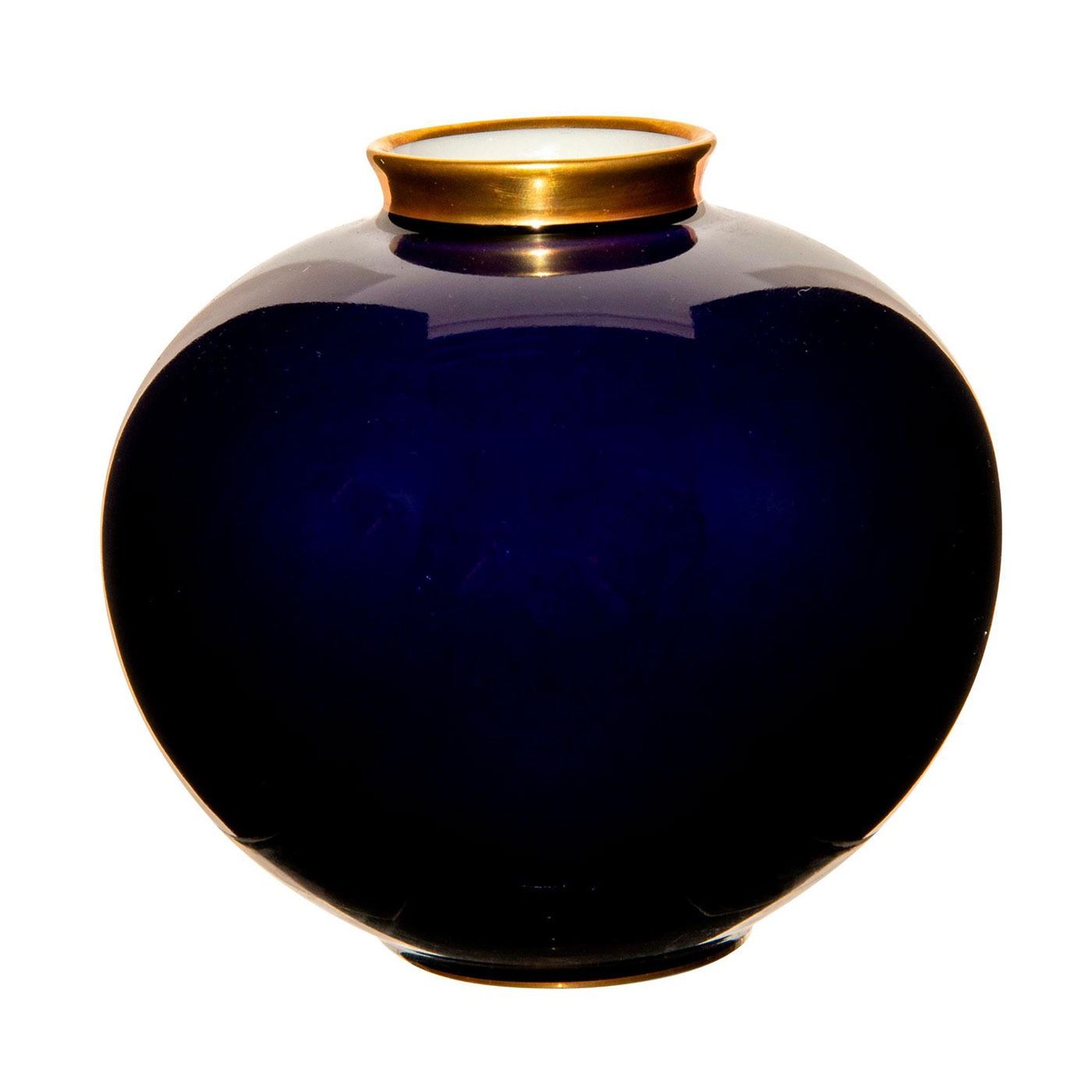 Bulbous form with deep rich cobalt glazed ground; gilded rim and base. Lindner backstamp.