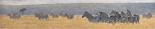 Lindsay B. Scott (b. 1955). Zebra Herd. 6 3/4" x 32 1/4" oil on board. Signed lower left. (est $1,000-1,500)