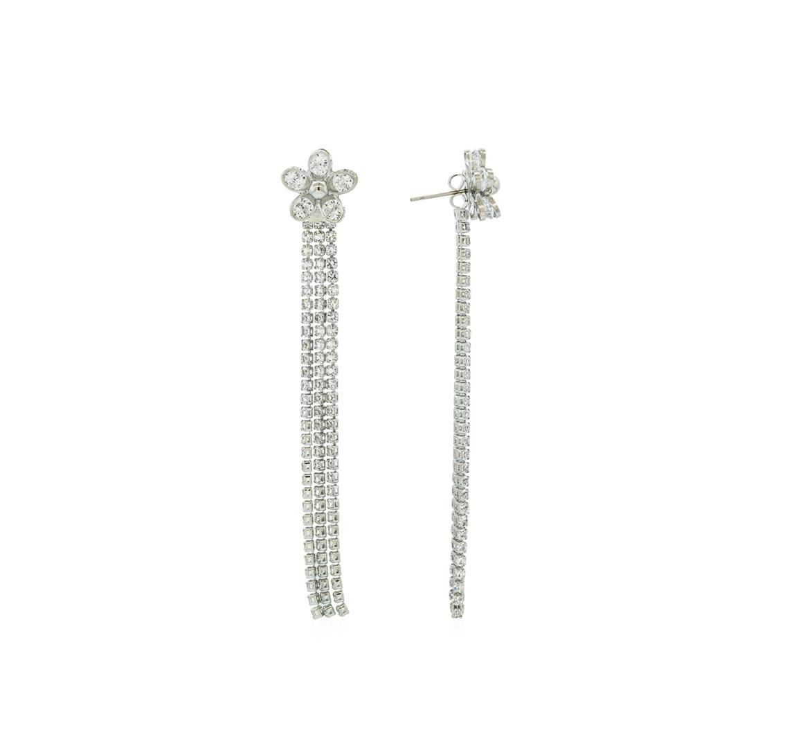 High end designer jewelry. Line Chain Drop Flower Post Earrings - Rhodium Plated. Rhodium Plated. Clear/ Silver. Post.