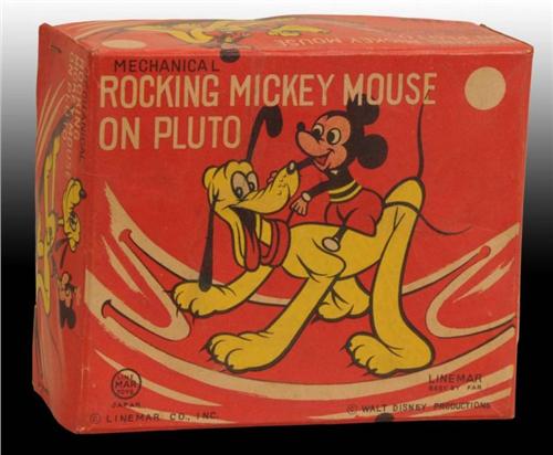 Description Japanese. Working. Includes scarce box. Marked "Walt Disney Productions". Wind-up toy is lithographed tin but Mickey and Pluto have rubber ears and tail. When wound, toy rocks back and forth. One of the most popular Linemar Disney toys. One of Mickey's ears and both of Pluto's have been replaced. Toy has minor scratching and wear. Some restoration to front of the box. Condition (Very Good - Excellent). Size 7" x 5".