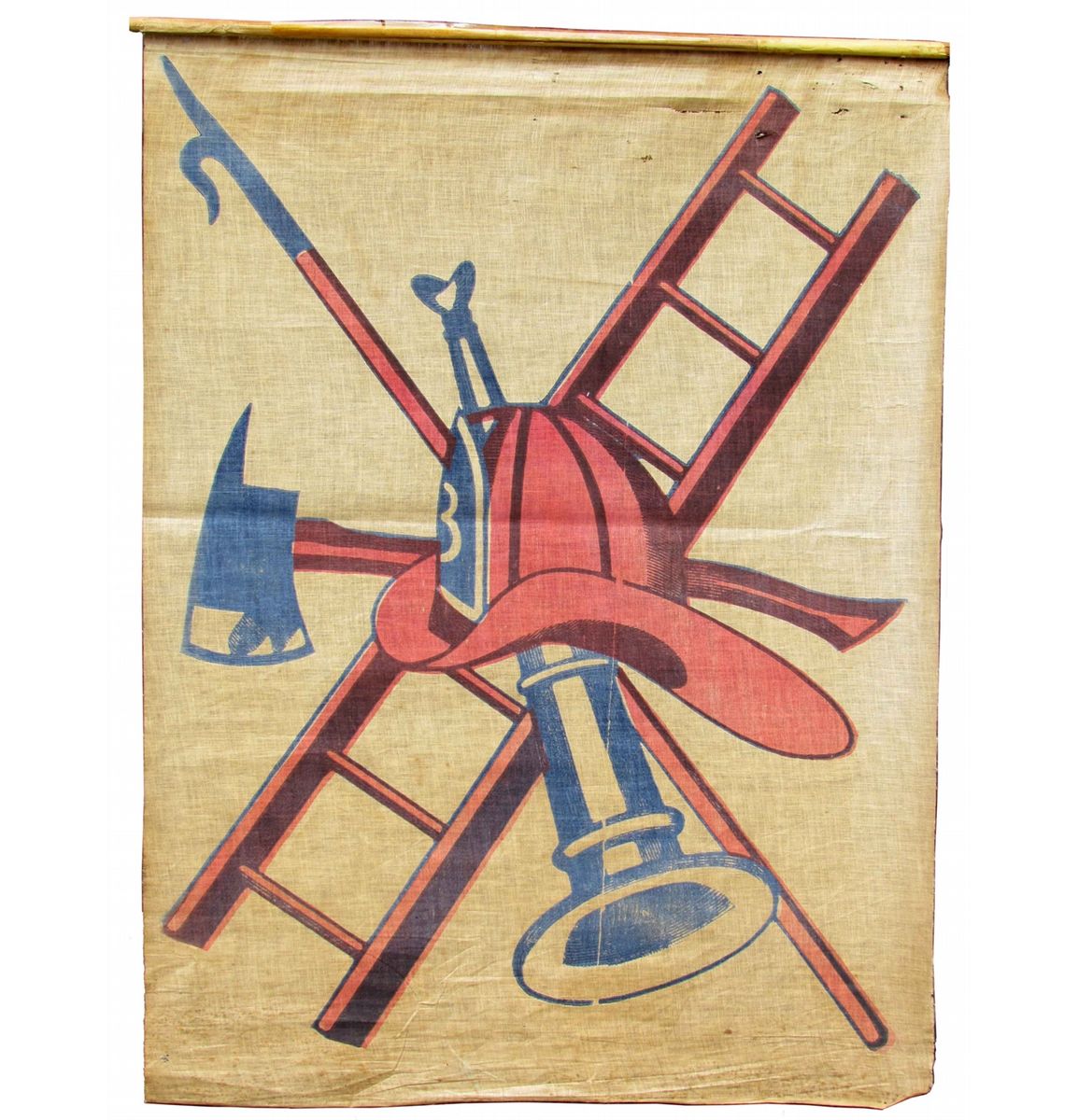 Linen Fire Banner. Crossed helmet, trumpet, axe, ladder and pike pole. Image intact, fabric very fragile. 26 X 35 inches.