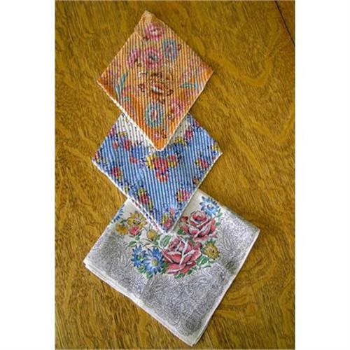 Three ladies hankies of large size. Purchased at an estate auction, they were tucked inside a bag with some greeting cards that were dated in the 1950's. I have not cleaned or refolded as I did not want to damage any of the crimping. The crimped hankies are both a flower motif: one in blue with blue, red, yellow flowers, the other in dark peach with blue, pink and burgandy flowers; the largest has pink roses and blue and yellow flowers. I find no holes, stains or tears. PAYPAL Accepted. USD Only.