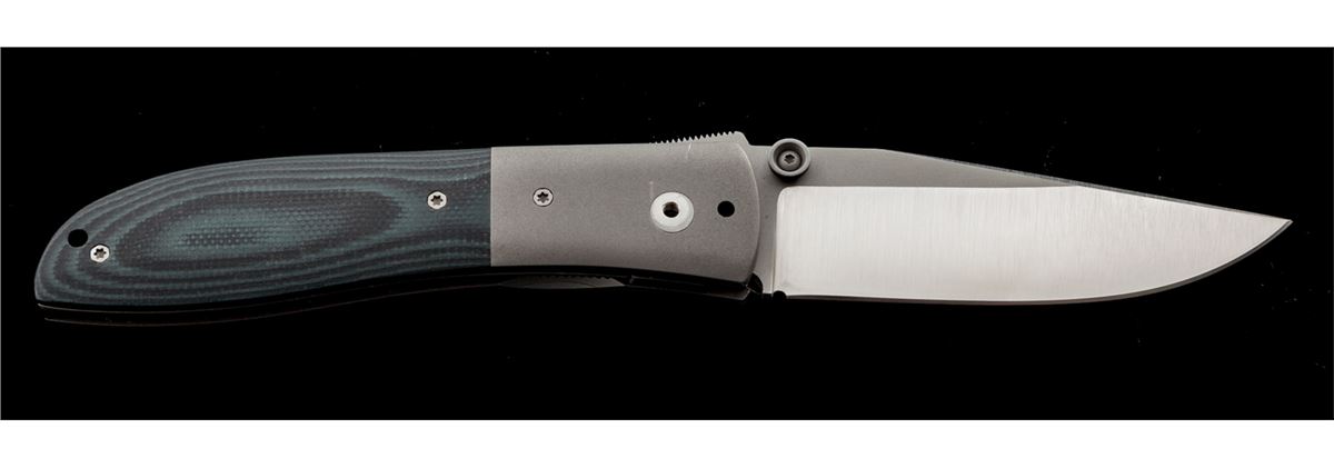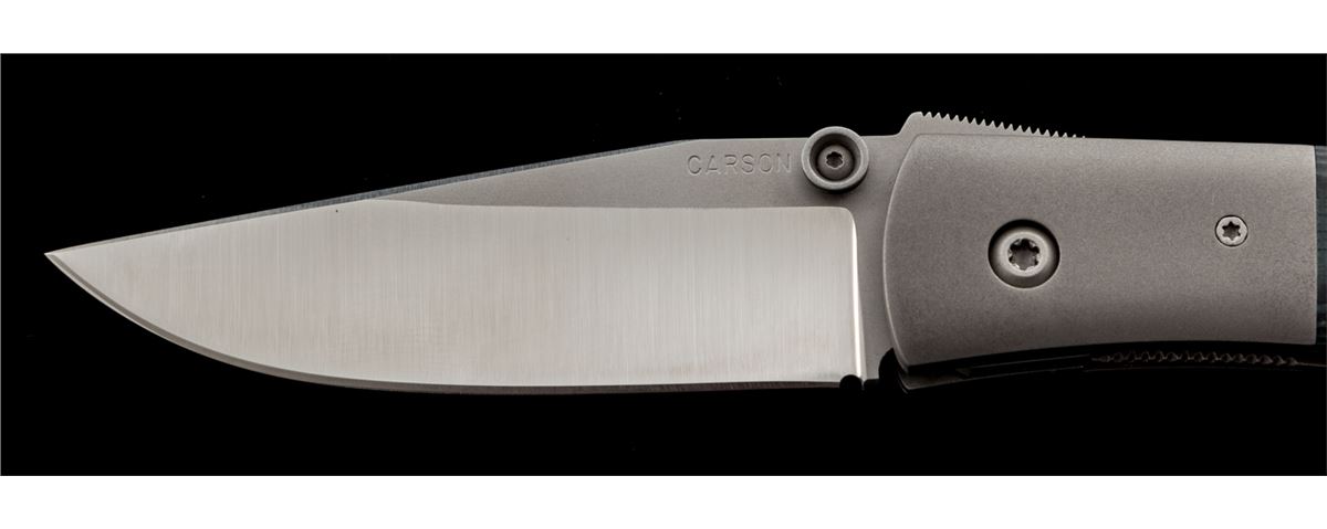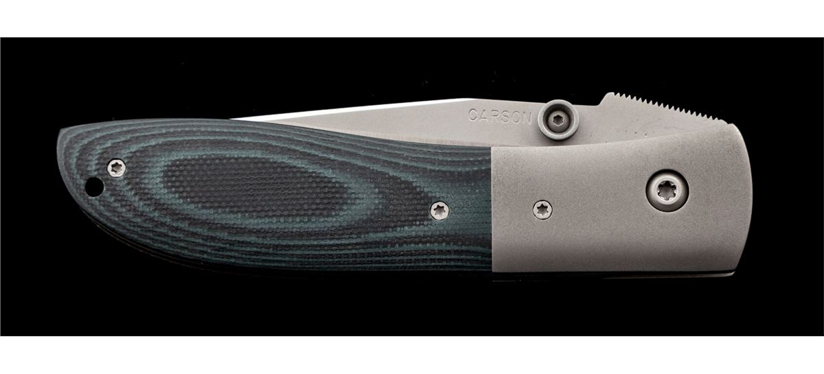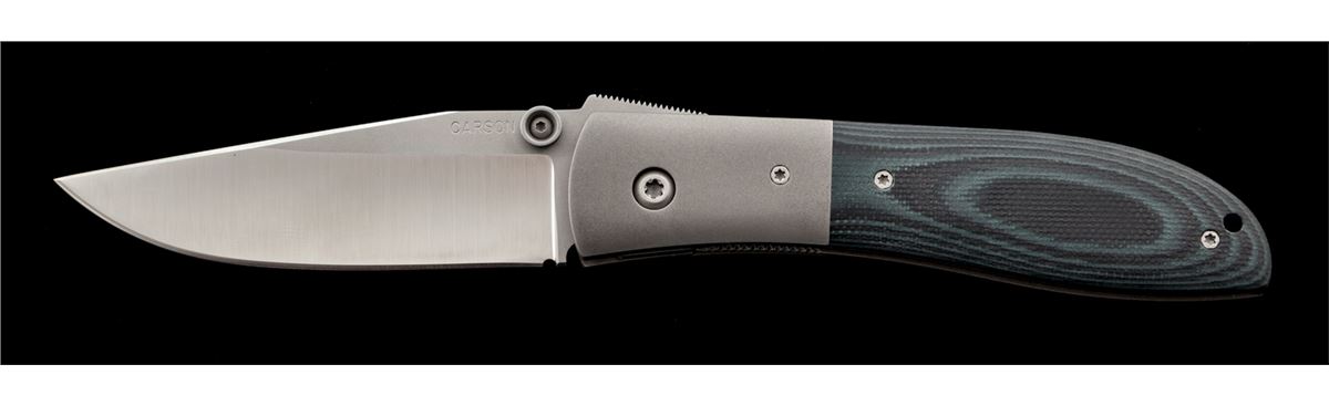 Liner Lock Folding Knife, by Kit Carson, 3'' clipped point blade marked near thumb stud ''CARSON'', 4'' overall closed length, titanium bead blast finished bolsters, dual thumb studs, black and blue G-10 scales with titanium hex head hardware. Condition is excellent showing no use. Belt clip has been removed leaving a small circular mark to the reverse side. Est.: $500-$700. (Ian Shein estate)