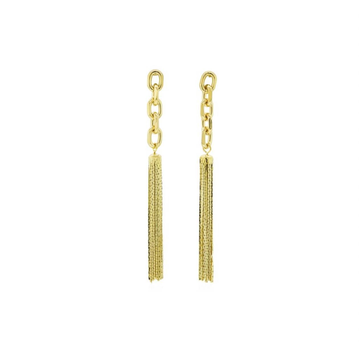High end designer jewelry. Link and Chain Tassel Post Earrings - Gold Plated. Gold Plated Stud Set. Gold. 3inches.