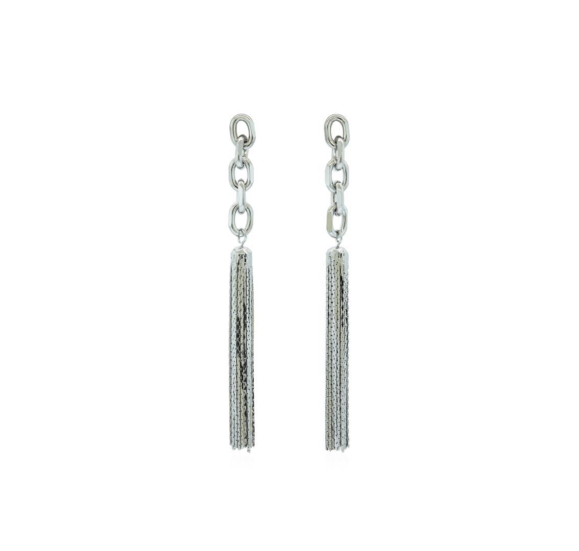 High end designer jewelry. Link and Chain Tassel Post Earrings - Rhodium Plated. Rhodium Plated Stud Set. Silver. 3inches.