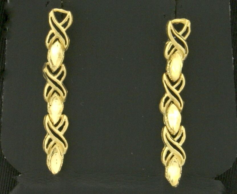 In 14k yellow gold. 1 1/4" long with friction backs. 2.1g.