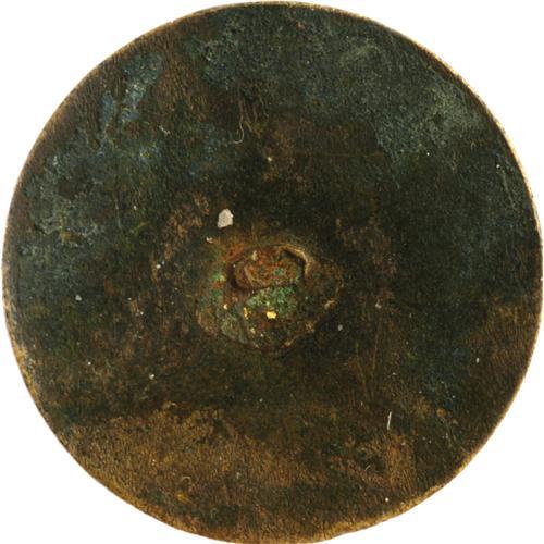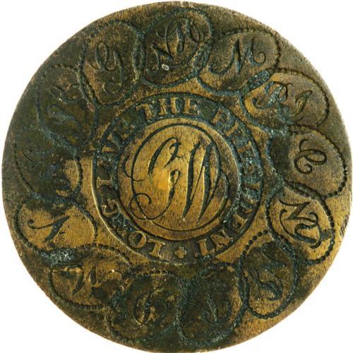 <B>Impressive George Washington 1789 "Linked States" Inaugural Shank Button.</B></I> This example displays with a smooth, pleasing surface, the loveliest of original light chocolate patinas, and very sharp lettering and devices. It exhibits only the slightest of wear to the convex section bearing the script "GW" in center. The shank is missing, unfortunately, the only negative about this popular GW button design. There is also some soiling on both sides as well as some trivial verdigris, noted for accuracy. All in all a fine copy of Albert WI 4-A. Diameter 34mm.