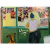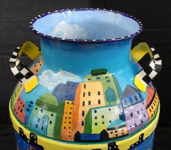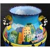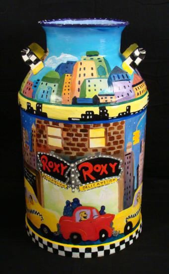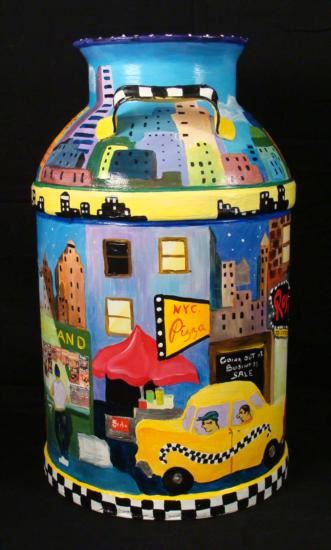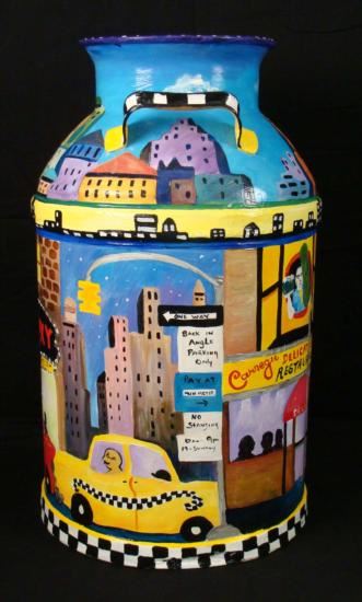 Artist Linnea Pergola has transformed this old milk can into a unique object of art. The great delis of New York City are portrayed around this can in all hand painted imagery. The artist's fanciful style, and knowledge of the Big Apple contribute to this wonderfully imagined cityscape. The images are accented by whimsical borders composed of taxicab checkerboard patterns, skylines, and clouds. Artist: Linnea PergolaTitle: "A Deli On Every Corner"Medium: Acrylic on a metal milk can Signed: "Linnea" on an image of a newsstandSize: 23 inches high, 13 1/2 inches in diameter at the base, and 9 inches in diameter at the opening Condition: Excellent; the light dents were on the can before painting, and they actually enhance its rustic appearance This attractive milk can has country charm, and big city appeal. It would be nice to display in a deli, or anywhere, for anyone who's a fan of New York City delicatessens. Biography:Linnea Pergola (1953-_) was born in Los Angeles, and developed an interest in travel. She joined the Peace Corps out of college, and was stationed in Southeast Asia. Her further explorations of foreign lands led her to Europe, Russia, and to the East Coast of the United States. This wanderlust became the inspiration for her art. She draws and paints various locales with an imaginative flair. Her art is well loved for its naive charm and originality.