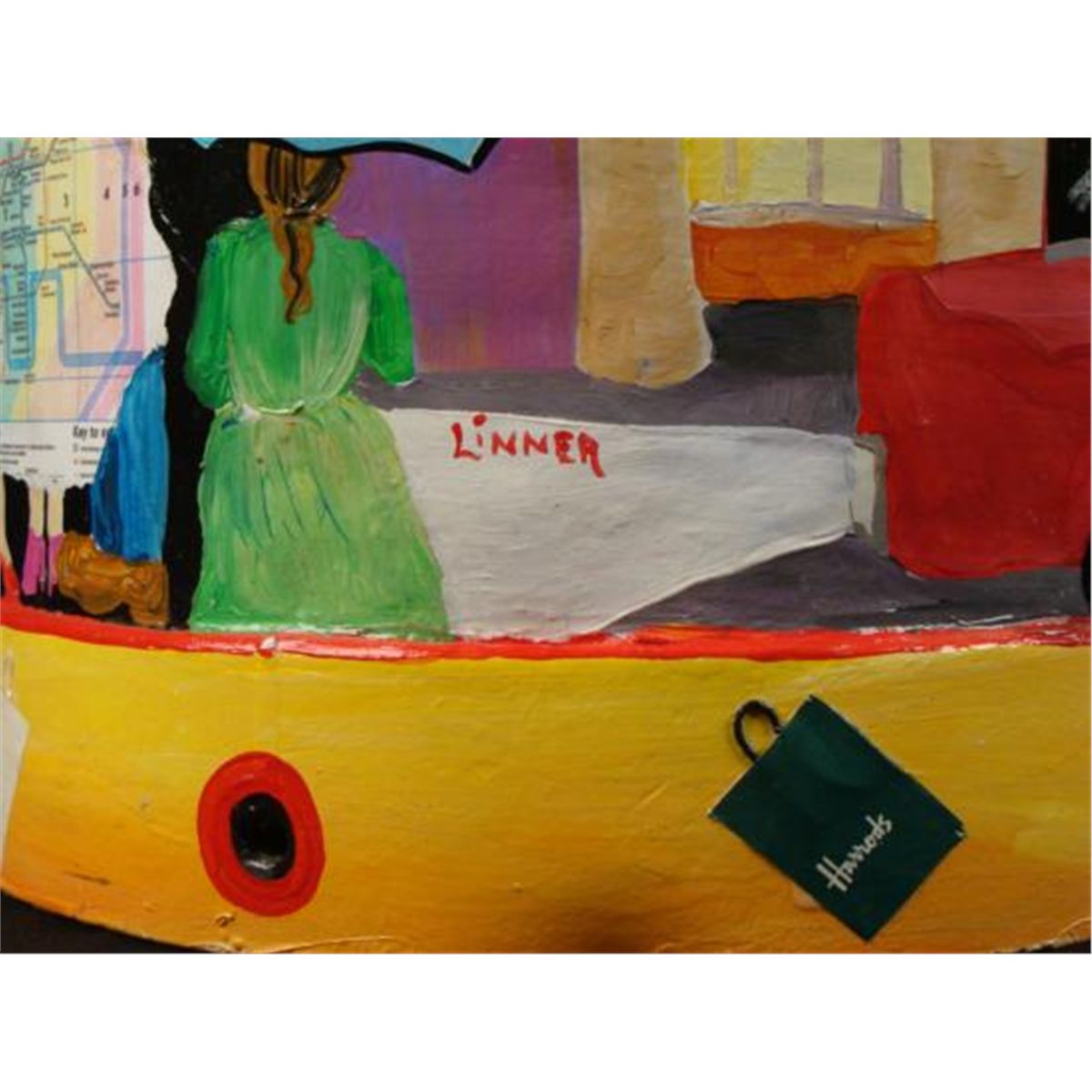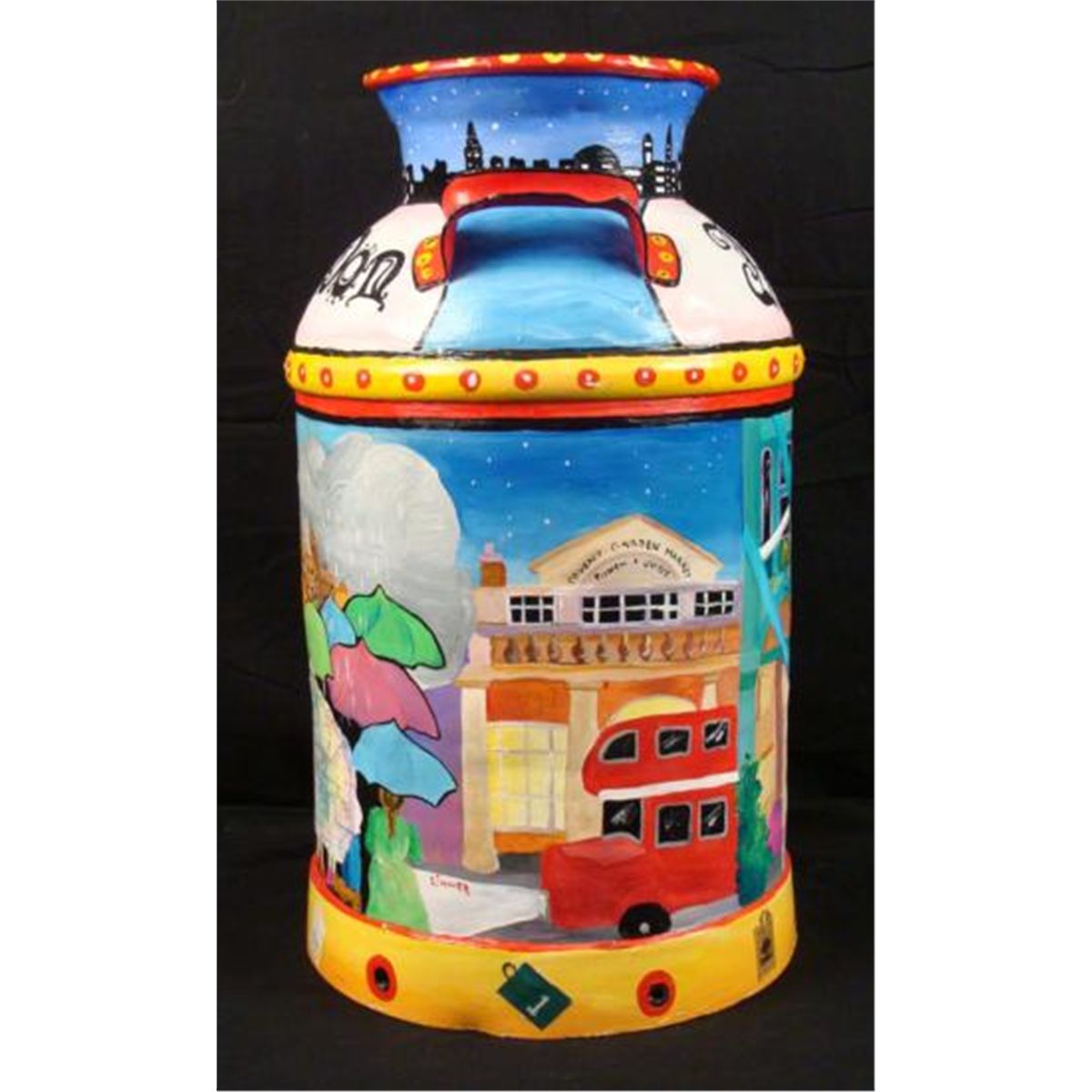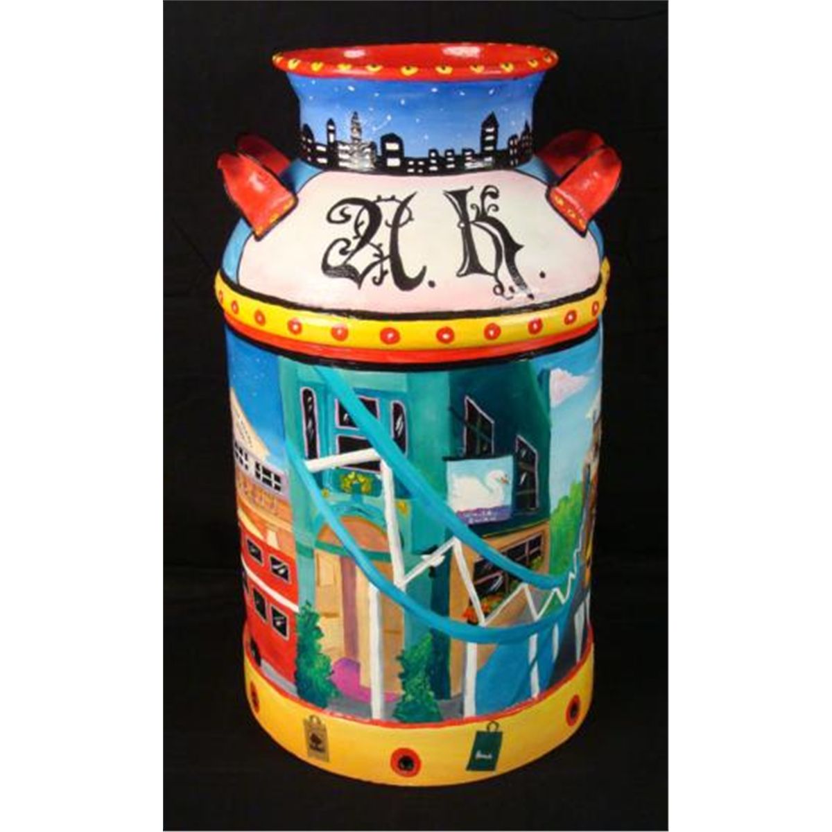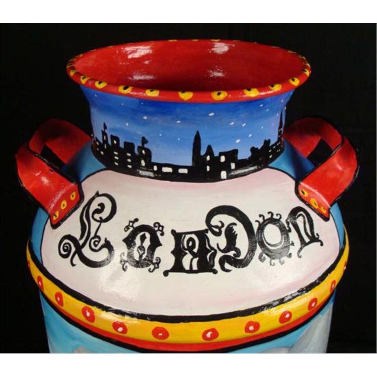 Artist Linnea Pergola has transformed this old milk can into a unique artistic creation. Scenes of London on a spring day surround the can in brightly colored painted. The artist's experience traveling in London, and her imaginative style, combine to make this truly original cityscape. The images are accented by whimsical borders composed of a skyline, and shopping bags from some favorite London stores. These bags are actually miniature bags that have been cut out and affixed to the can. * Artist: Linnea PergolaTitle: "London In The Spring"Medium: Acrylic on a metal milk can Signed: "Linnea" appearing in the headlamp beams of a double decker busSize: 23 1/2 inches high, 13 1/2 inches in diameter at the base, and 9 inches in diameter at the opening Condition: Excellent; the dents, mostly on one side, were present before the painting, and they go along with the artist's intention of giving a natural, rustic appearance From the country to the big city--this painted milk can mixes old time rural simplicity with historic urban sophistication. It will make a wonderful display for anyone who loves that city by the Thames. Biography: * Linnea Pergola (1953-_) was born in Los Angeles, and developed an interest in travel. She joined the Peace Corps out of college, and was stationed in Southeast Asia. Her further explorations of foreign lands led her to Europe, Russia, and to the East Coast of the United States. This wanderlust became the inspiration for her art. She draws and paints various locales with an imaginative flair. Her art is well loved for its naive charm and originality. *