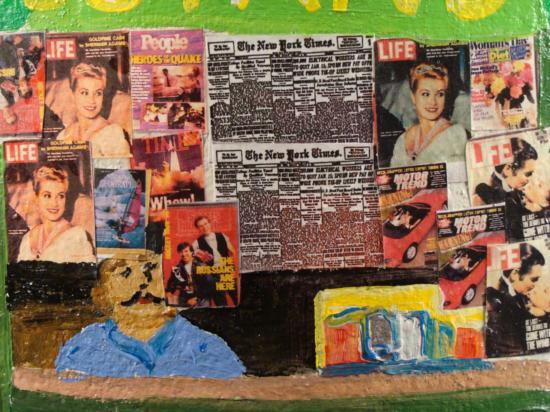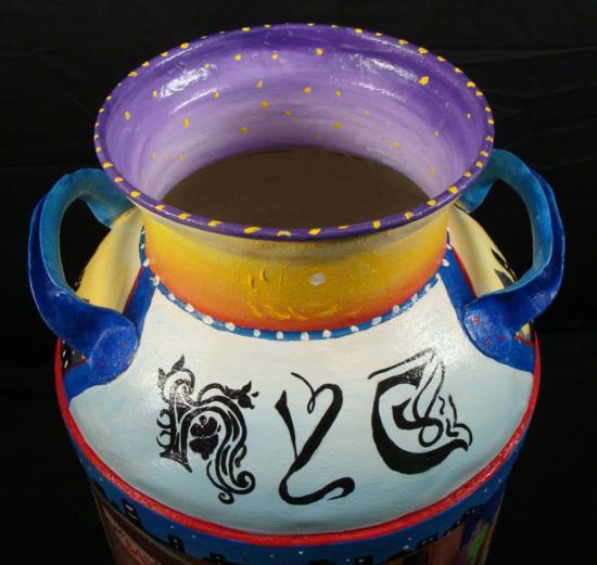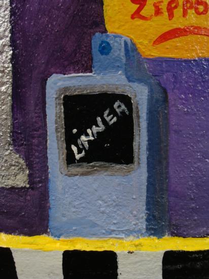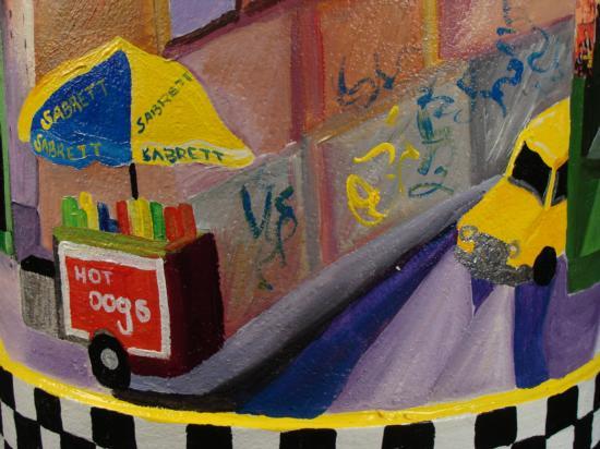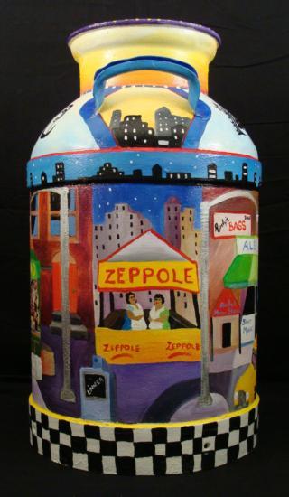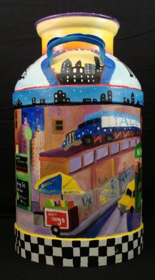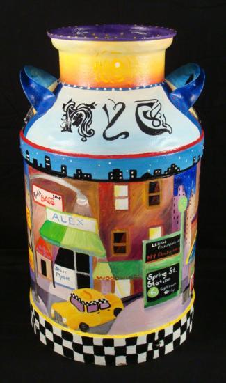 Artist Linnea Pergola has transformed this old milk can into a unique work of art. A scene of the Spring Street Station subway stop in Manhattan has been painted right onto the can. The newspaper stand has copies of magazine covers pasted onto the display. The artist's fanciful style, and love of New York really shine through in her coloful depiction of vibrant street scenes. The images are accented by whimsical borders composed of taxicab checkerboard patterns, and skylines. * Artist: Linnea Pergola Title: "Spring Street Station" Medium: Acrylic on a metal milk can Signed: "Linnea" on an image of a newspaper machine Size: 23 inches high, 13 1/2 inches in diameter at the base, and 9 inches in diameter at the opening Condition: Excellent; the light dents were on the can before painting, and they actually enhance its rustic appearance A delightful juxtaposition of country and city charm, this milk can is a unique piece of original art. It will be wonderful to display in your home or business, whether you live in the country, in the big city, or anyplace in between. * Biography: * Linnea Pergola (1953-_) was born in Los Angeles, and developed an interest in travel. She joined the Peace Corps out of college, and was stationed in Southeast Asia. Her further explorations of foreign lands led her to Europe, Russia, and to the East Coast of the United States. This wanderlust became the inspiration for her art. She draws and paints various locales with an imaginative flair. Her art is well loved for its naive charm and originality. *